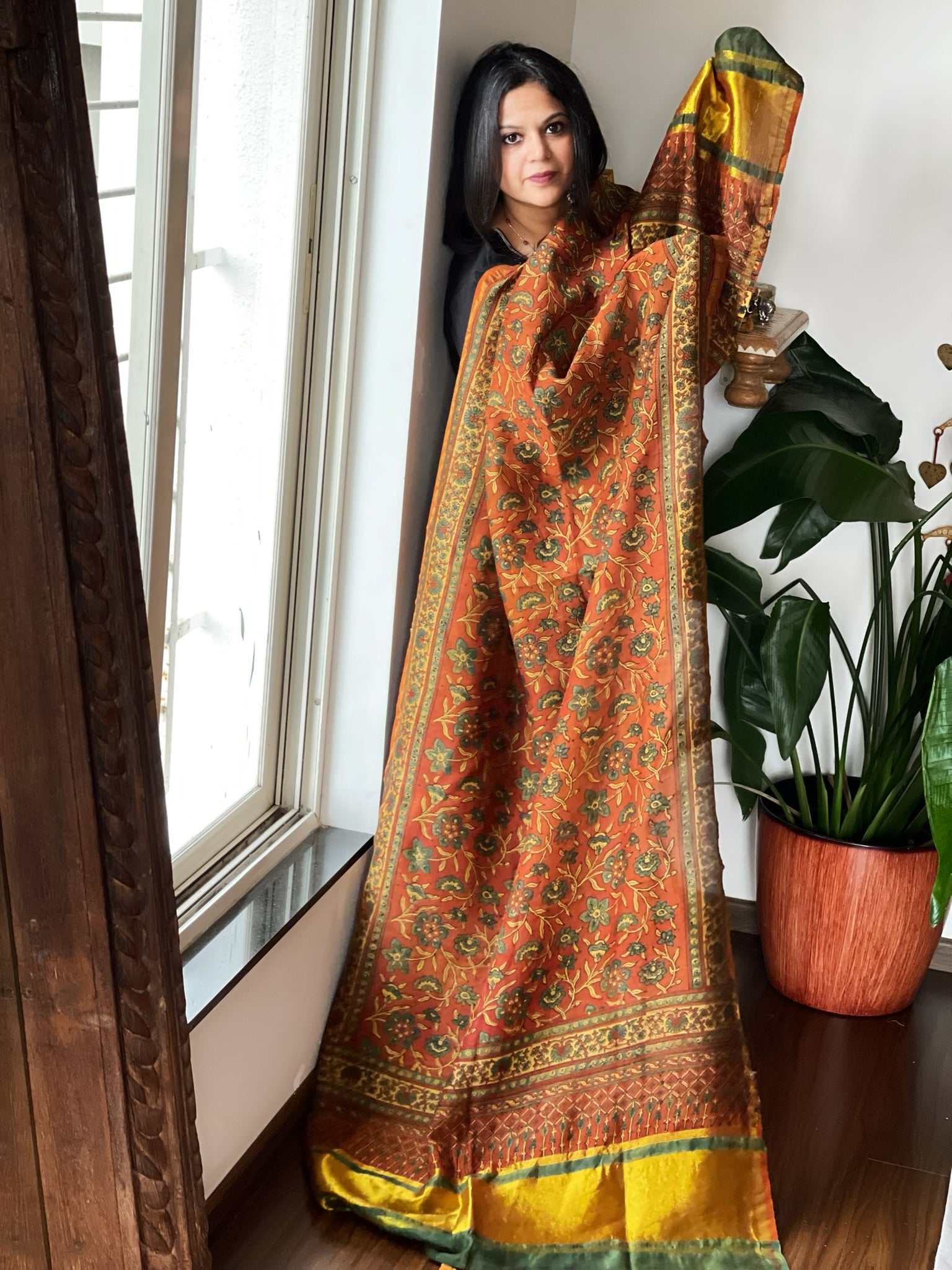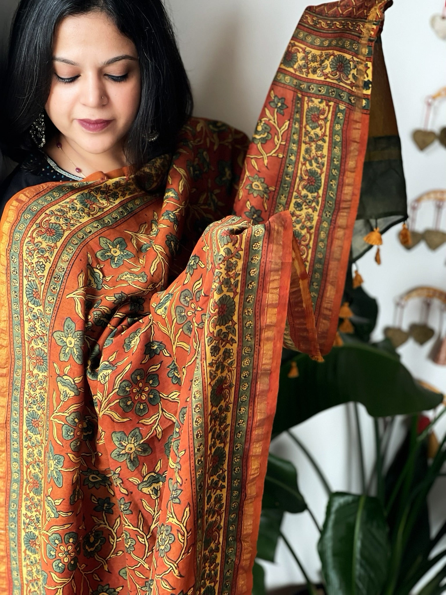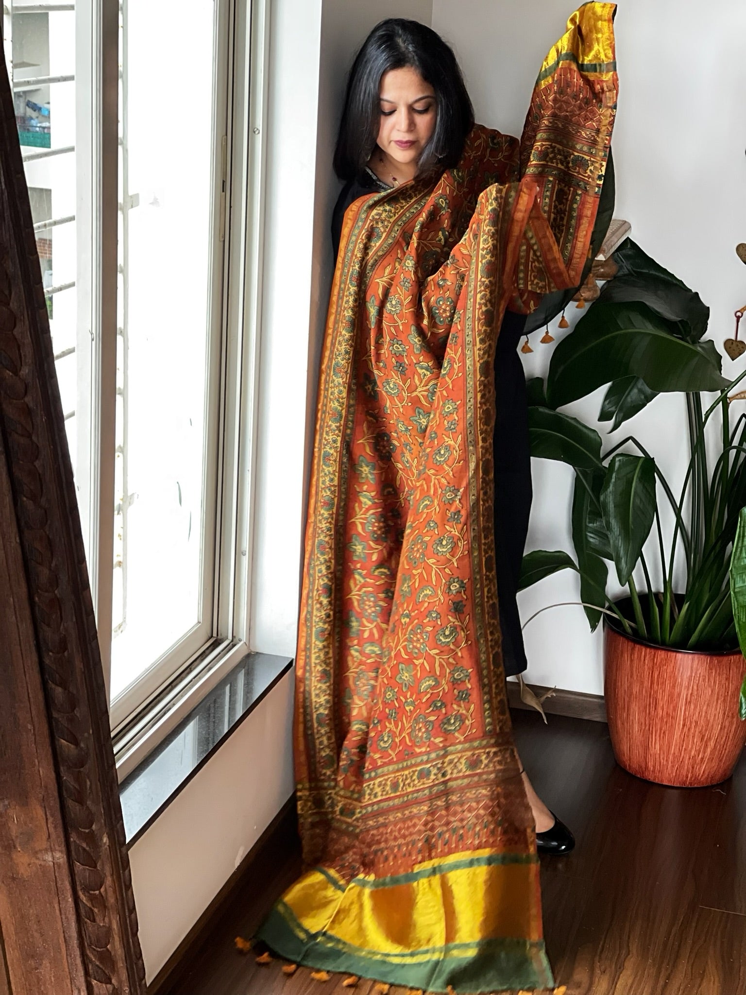 Expertly crafted from 100% pure Chanderi silk, this Ajrakh handblock printed dupatta showcases the stunning beauty of traditional Indian textiles. The intricate handblock print adds a touch of sophistication and elegance to any outfit. Elevate your wardrobe with this luxurious and versatile piece!