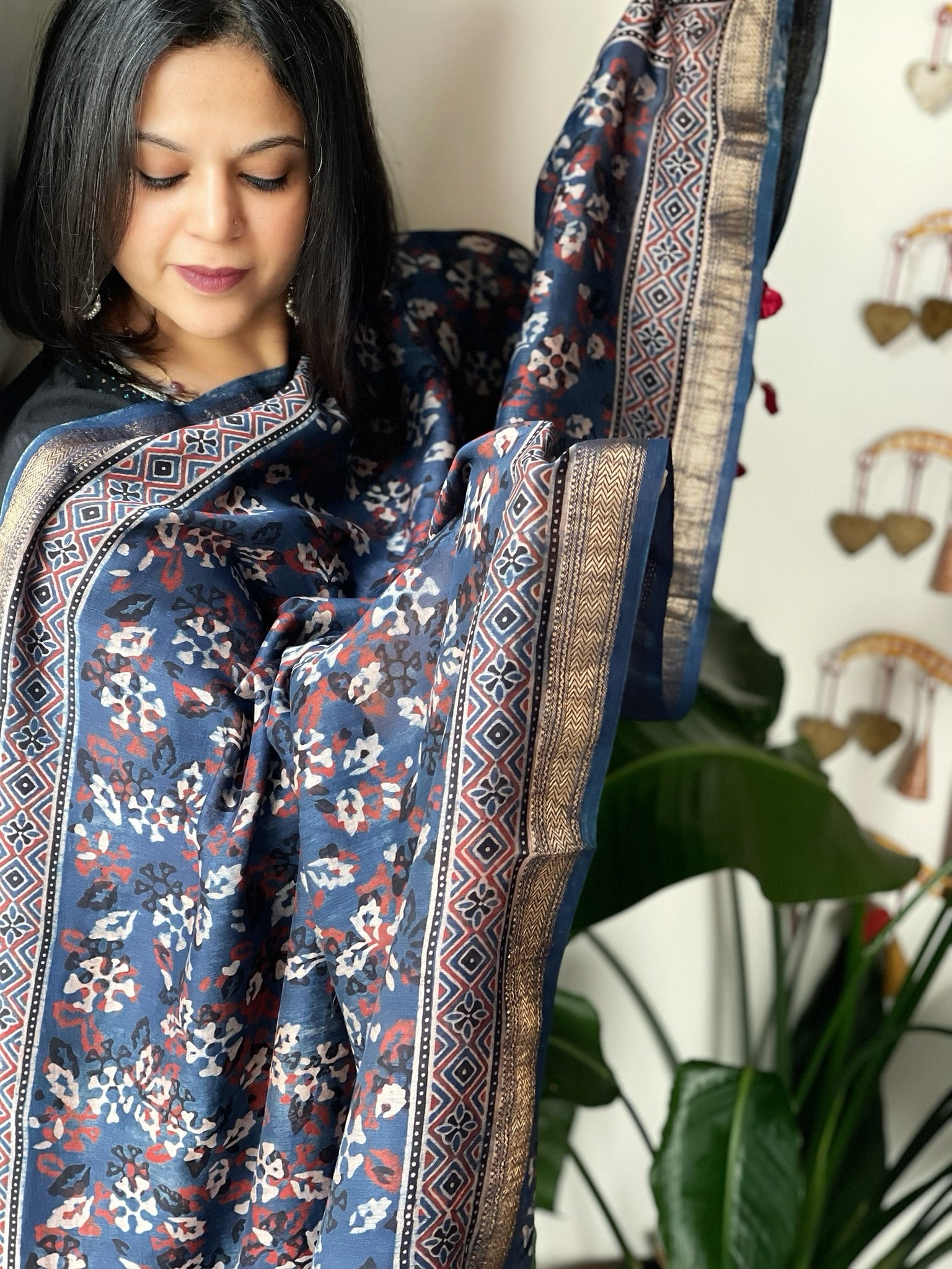 Blue Ajrakh Handblock Printed Dupatta on Chanderi Silk