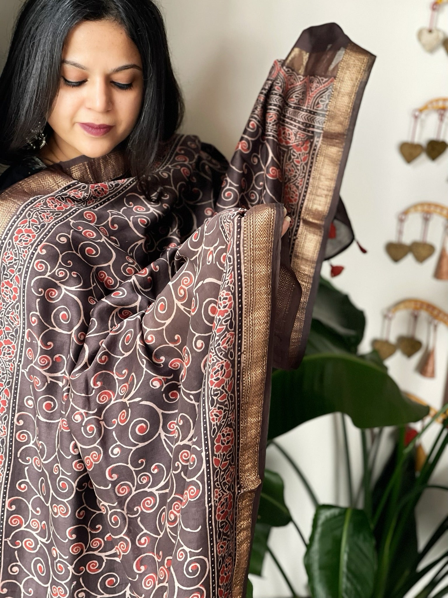 Lite Brown Ajrakh Handblock Printed Dupatta on Chanderi Silk