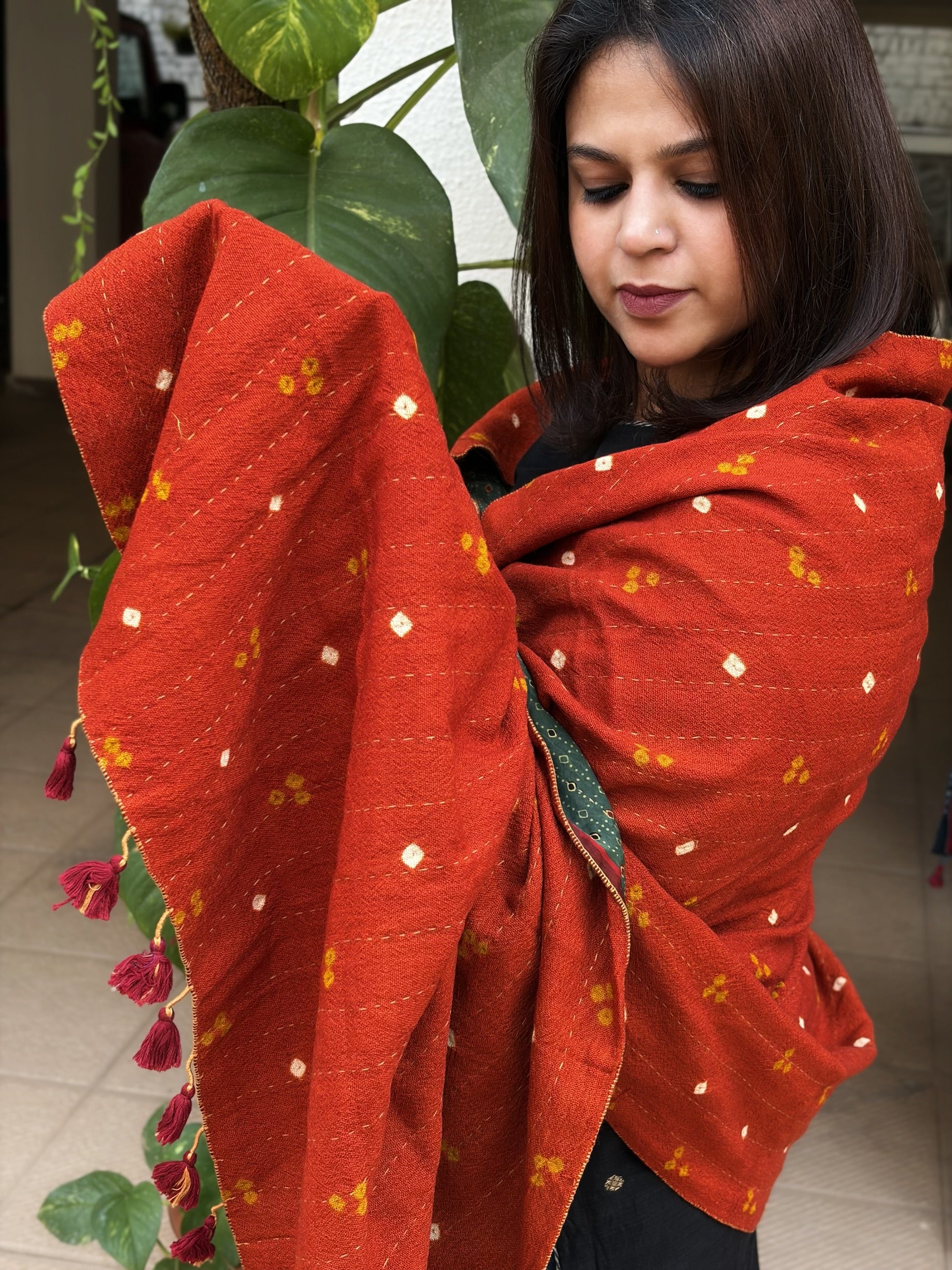 Ajrakh Handblock Printed Silk-Woollen Shawl. Each piece features hand-carved block prints applied through a labour-intensive process. The silk-woollen composition delivers warmth without weight, making it equally suited to layered styling or standalone draping. A collector's piece for those who value heritage craftsmanship and timeless versatility.