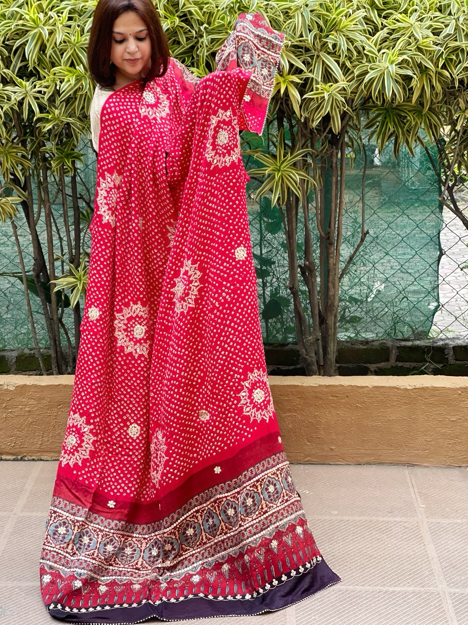 Elevate your style with our Handmade Rai Bandhej Dupatta. Made from Pure Gajji Silk, the Ajrakh Handblock printed pallu boasts exquisite craftsmanship. Complete with intricate Gotapatti handwork, this unique piece is perfect for special occasions.