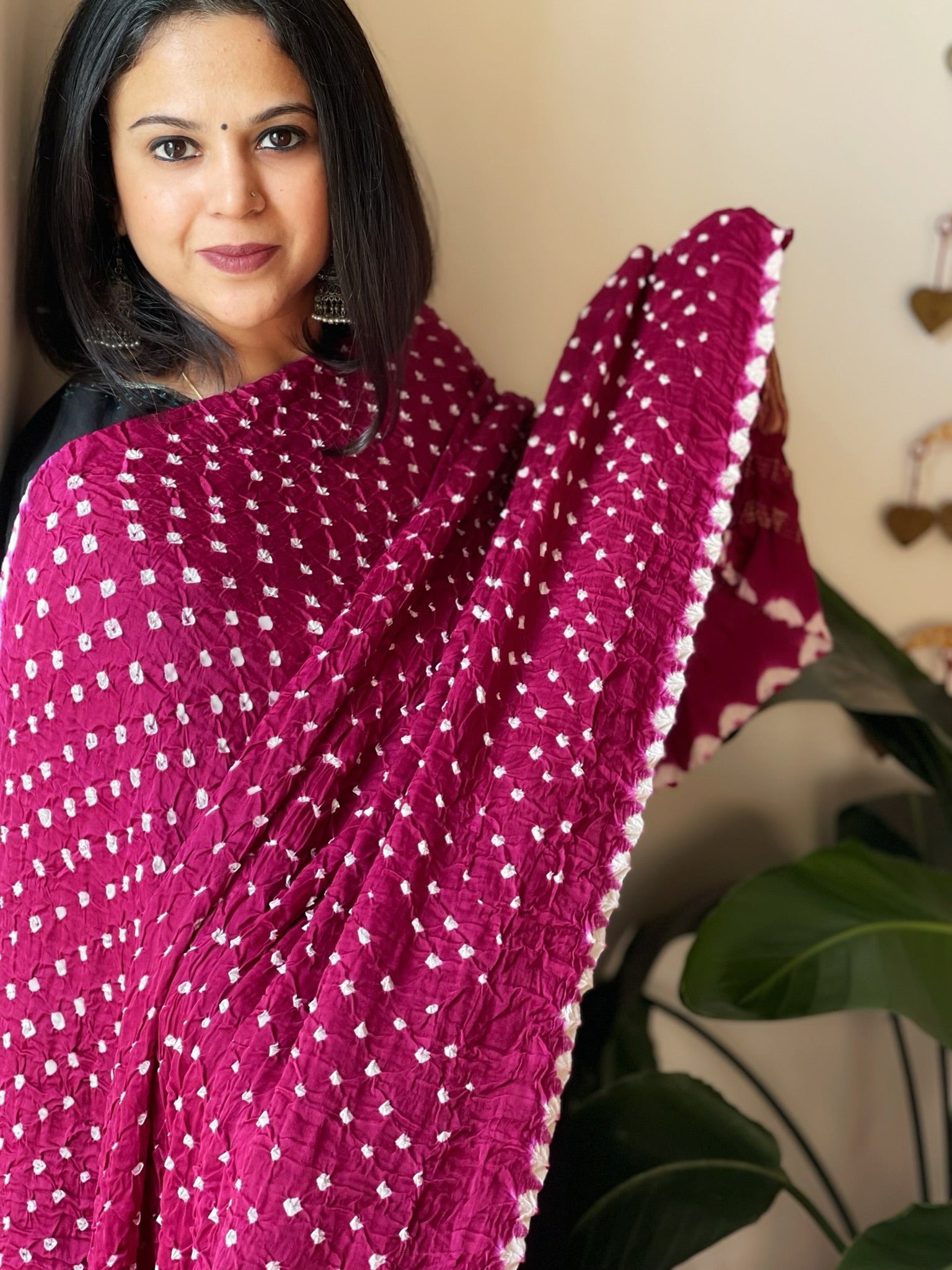 This stunning bandhani dupatta boasts a luxurious zari pallu in modal silk. Its vibrant colors and versatility make it a perfect addition to both office and occasion wear. Elevate your wardrobe with this elegant and stylish piece.