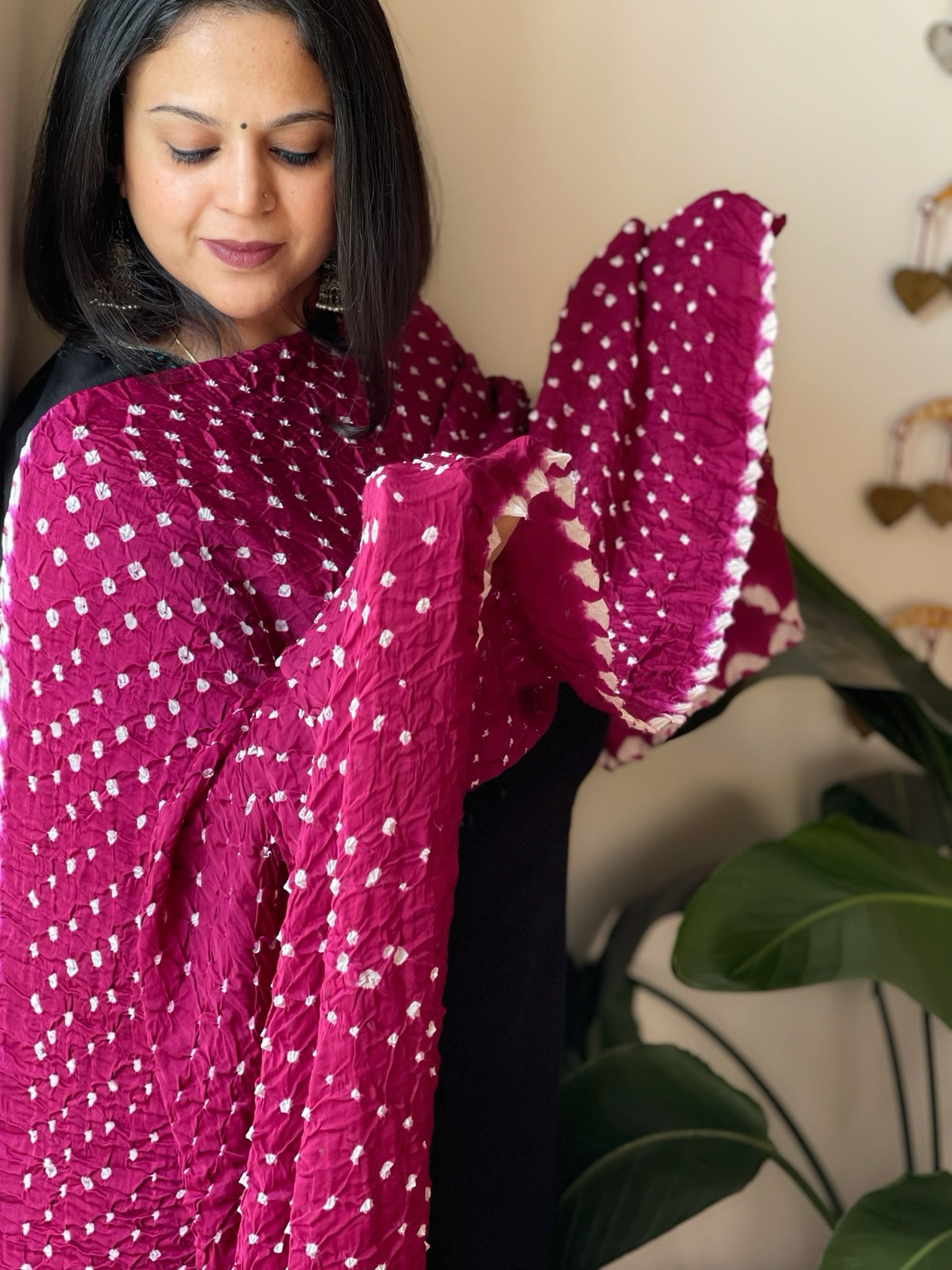 Note: Product colour may vary slightly due to photographic lighting sources or your screen/monitor setting. This dyed bandhani dupatta will bleed a little during initial use, so we recommend, this dupatta be worn on dark color suits/kurtis for the first few dry clean cycles.