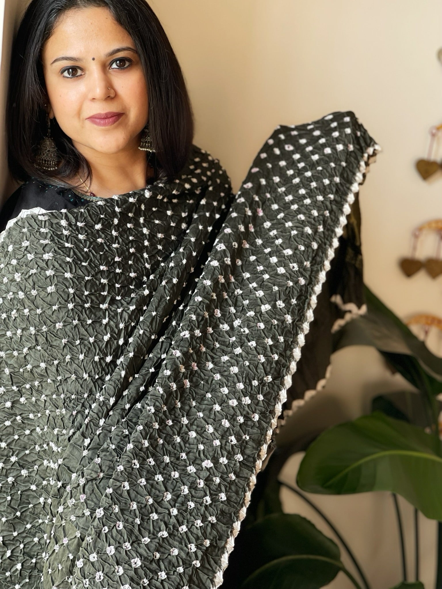 Note: Product colour may vary slightly due to photographic lighting sources or your screen/monitor setting. This dyed bandhani dupatta will bleed a little during initial use, so we recommend, this dupatta be worn on dark color suits/kurtis for the first few dry clean cycles.