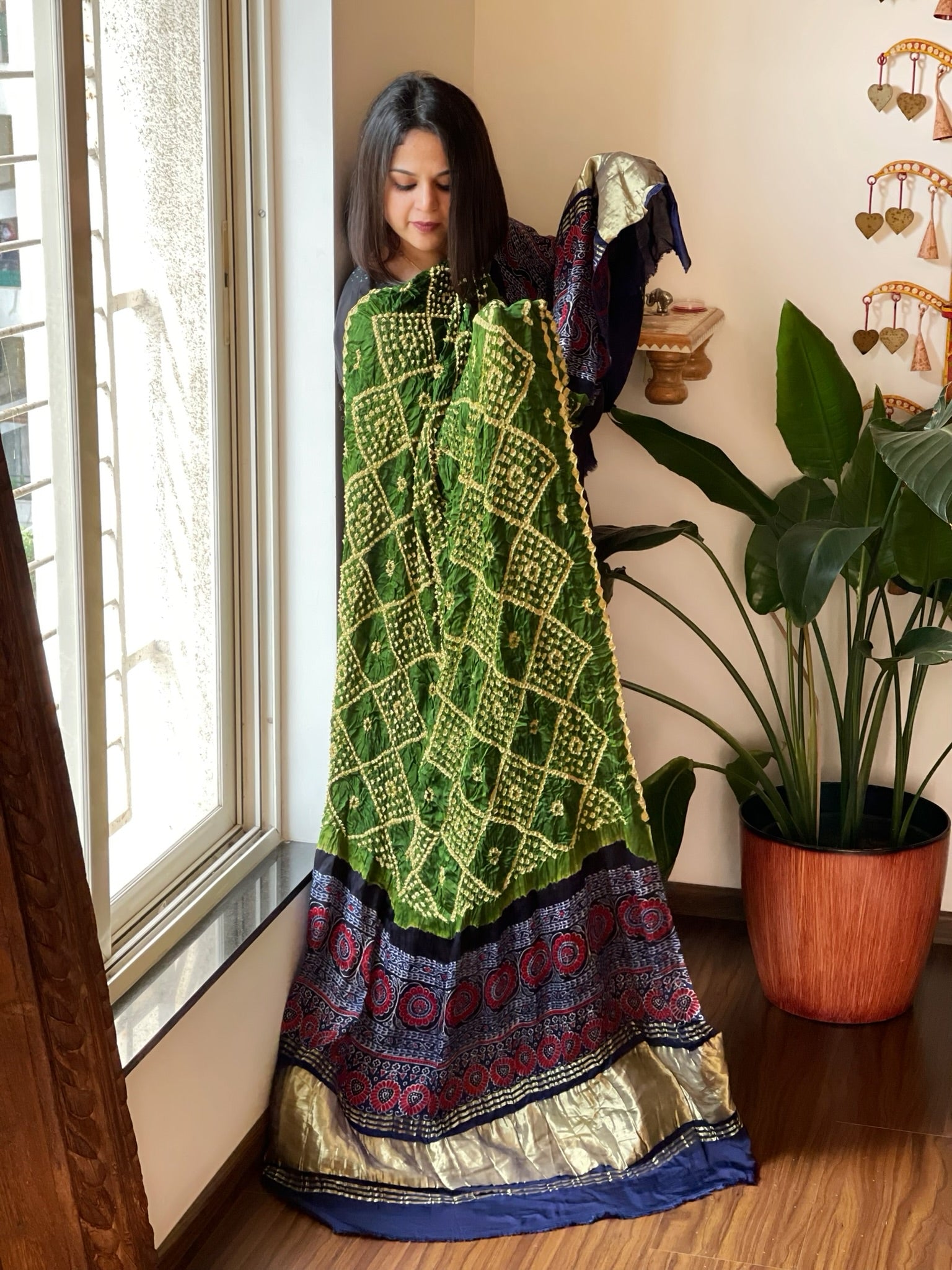 Green Bandhani with Ajrakh Dupatta in Modal Silk