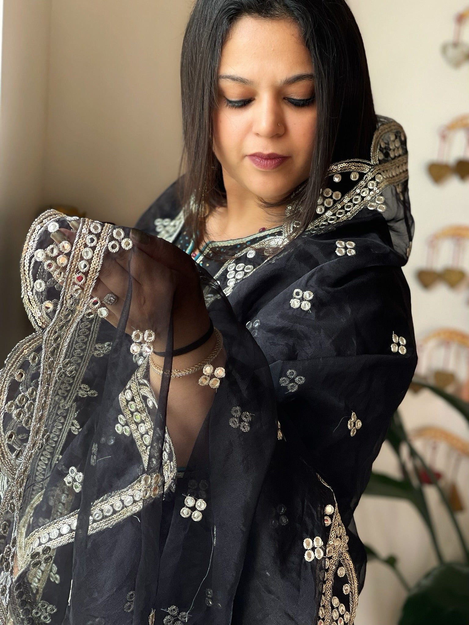 This organza dupatta features stunning foil mirror work, adding a touch of elegance to any outfit. Lite and flowy, it is not only versatile but also makes for a great gift. Elevate your style with this beautiful accessory.