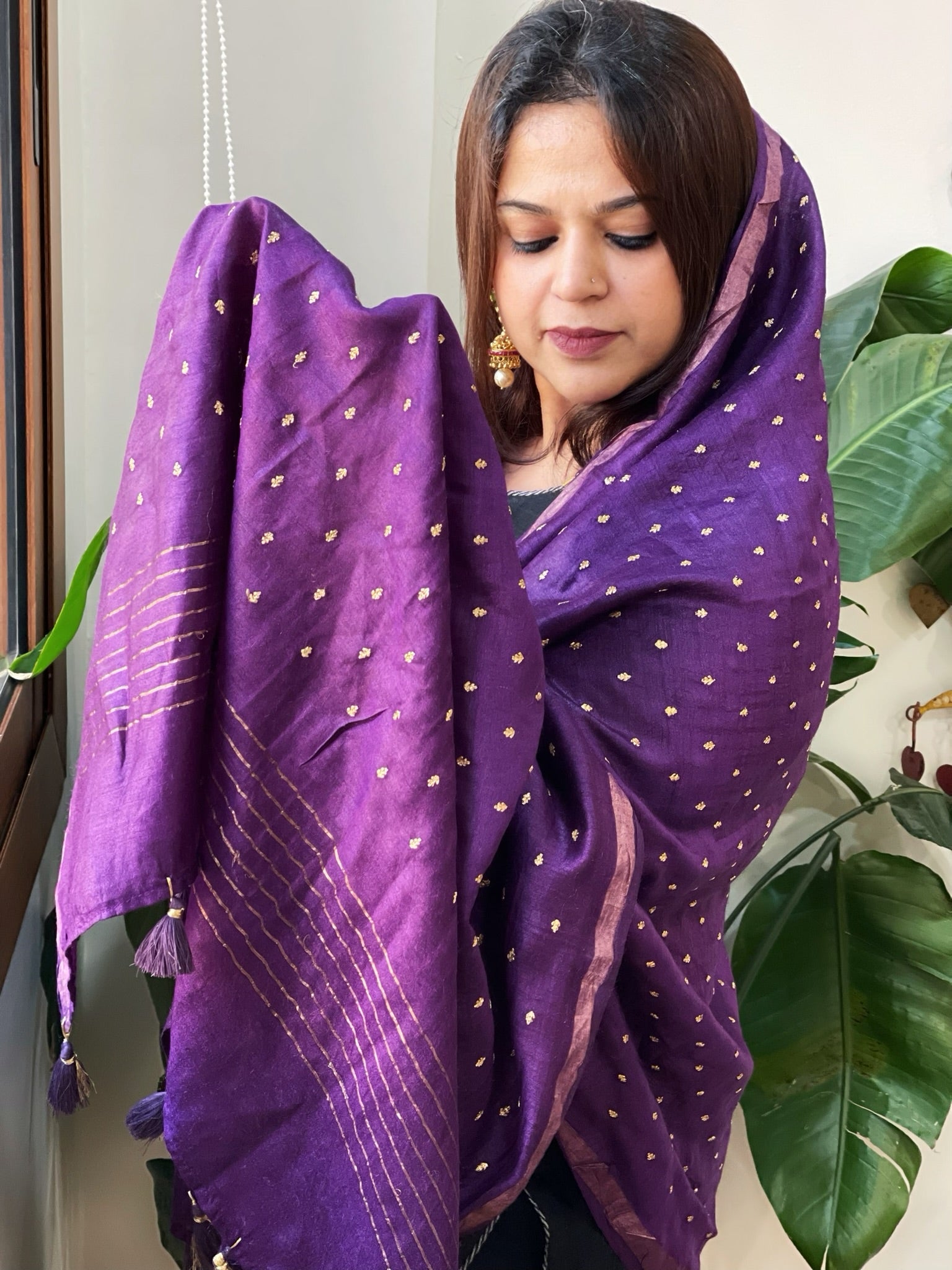 Purple Handwoven Muga Silk dupattas with Hand Embroidery