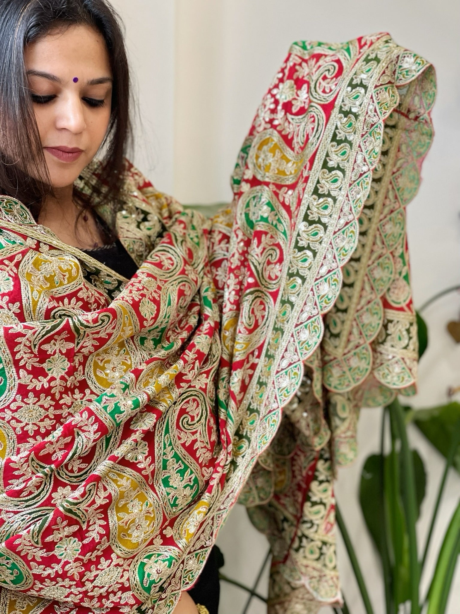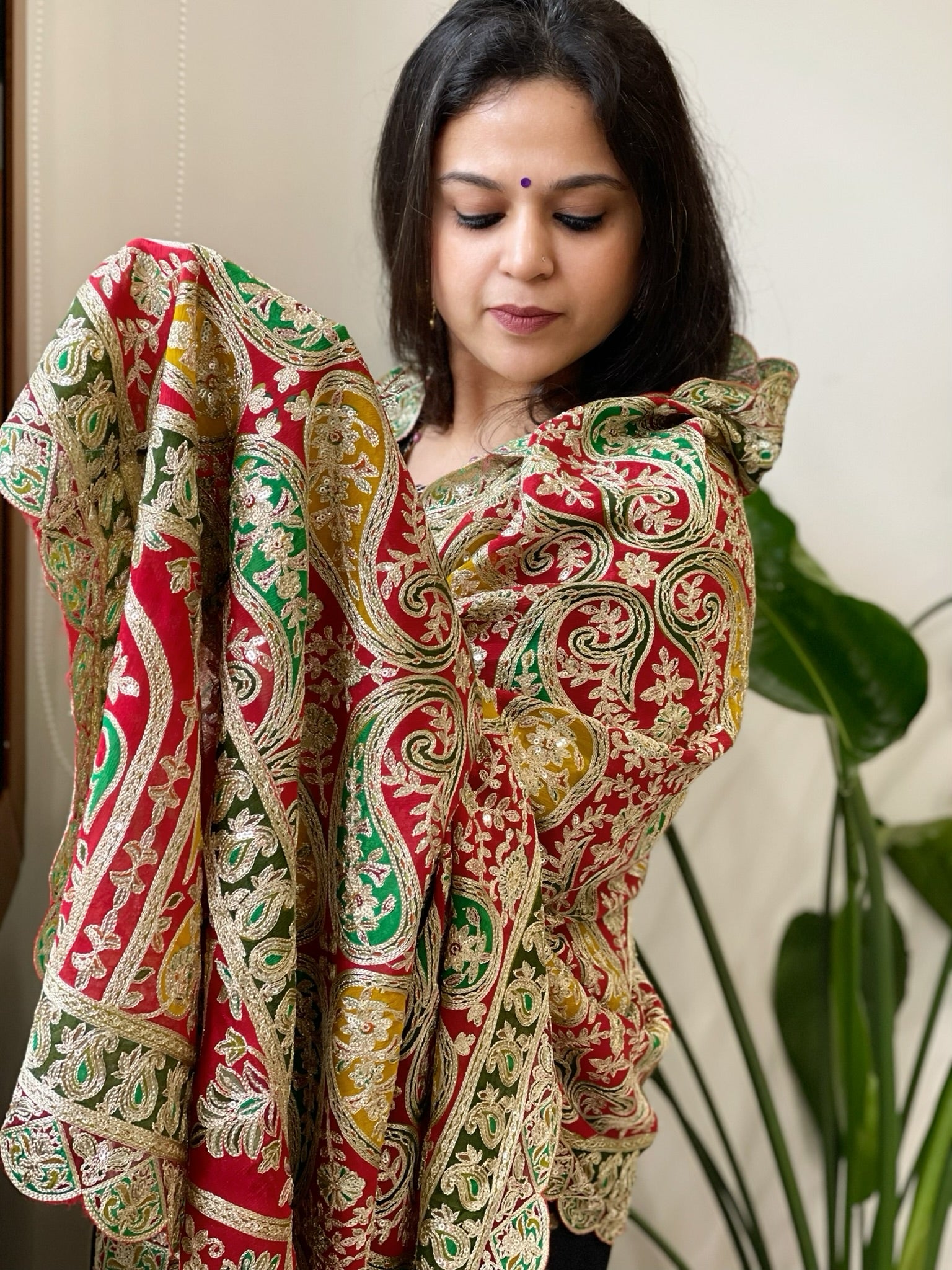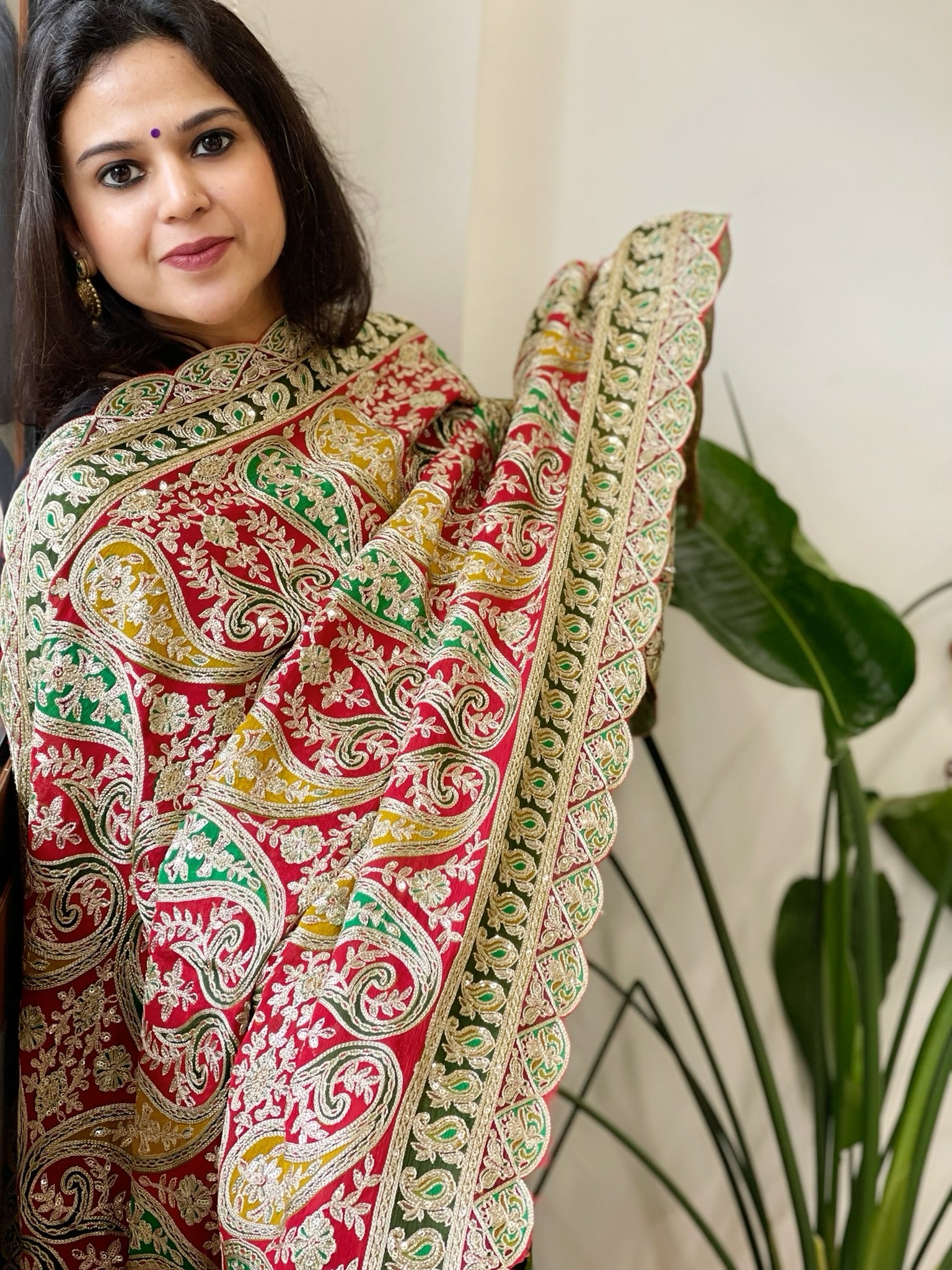 Red Chinon Dupatta with Aari Embroidery