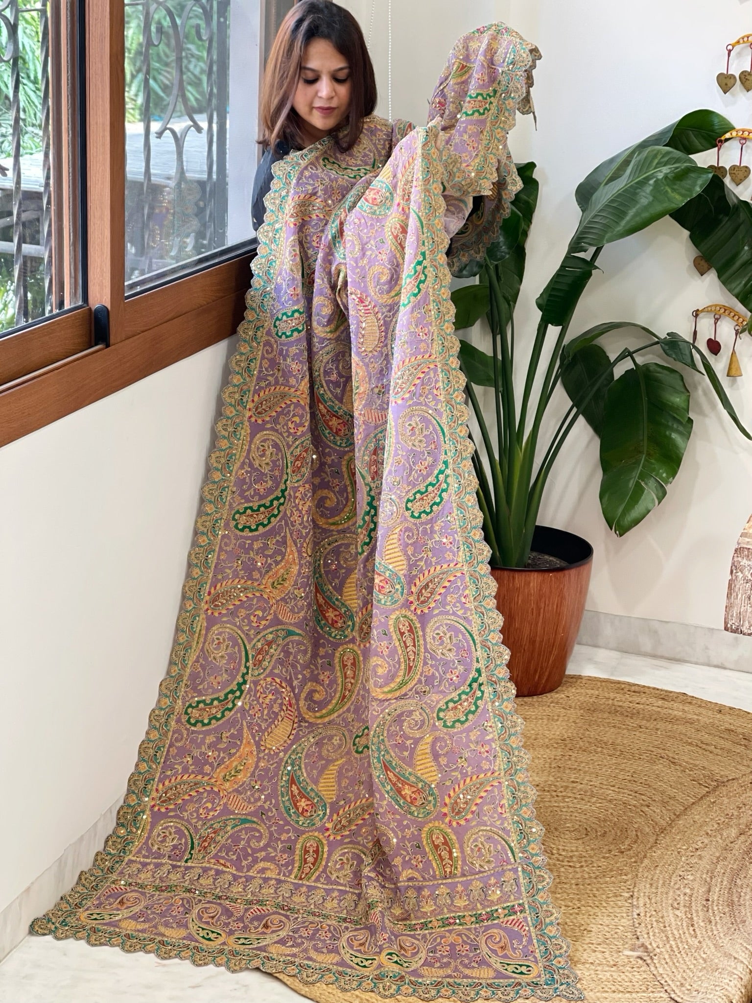 Elevate your ethnic ensemble with this exquisite Chinon Dupatta, featuring intricate aari embroidery that adds a touch of elegance and opulence. making it an ideal accessory for festive occasions and royal celebrations.