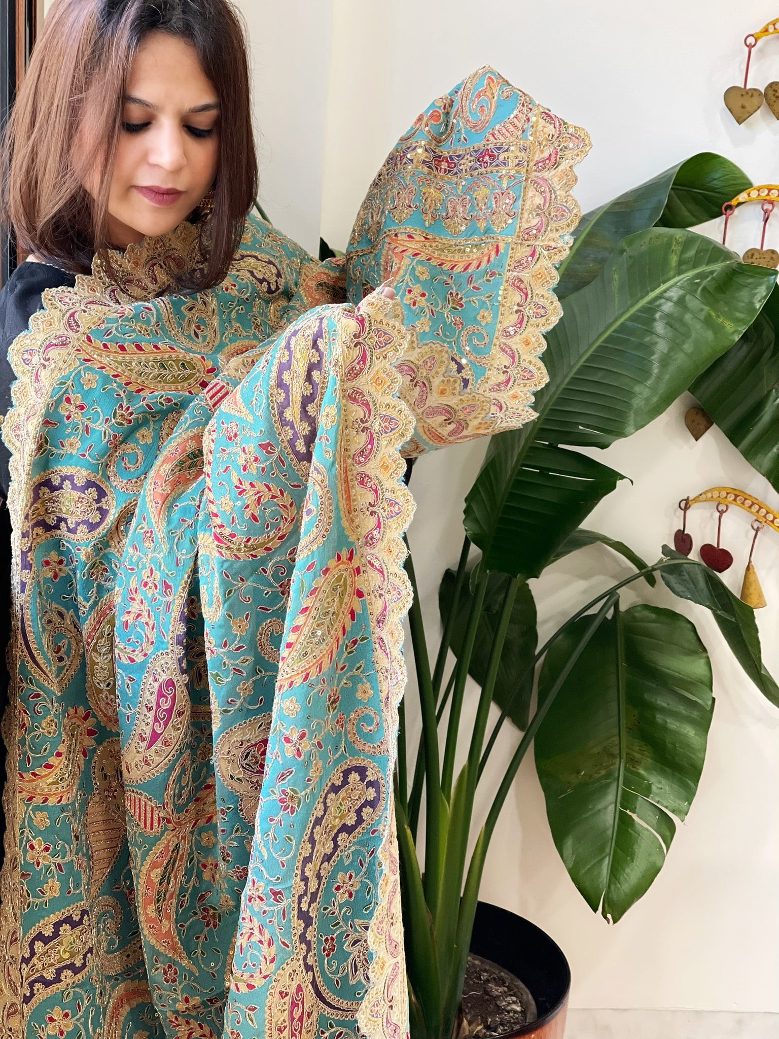 Elevate your ethnic ensemble with this exquisite Chinon Dupatta, featuring intricate aari embroidery that adds a touch of elegance and opulence. making it an ideal accessory for festive occasions and royal celebrations.