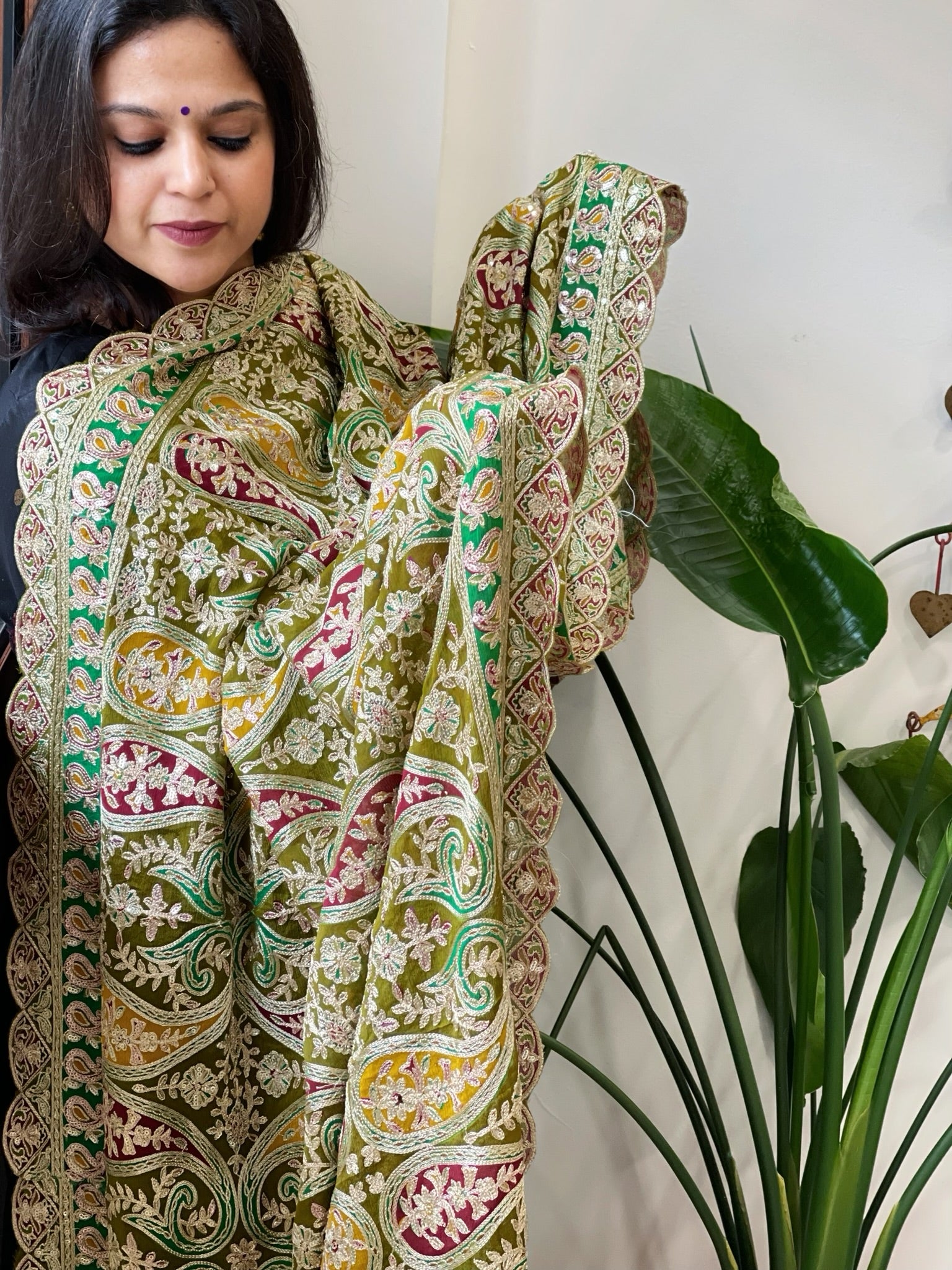 Mehendi Green Chinon Dupatta with Aari Embroidery