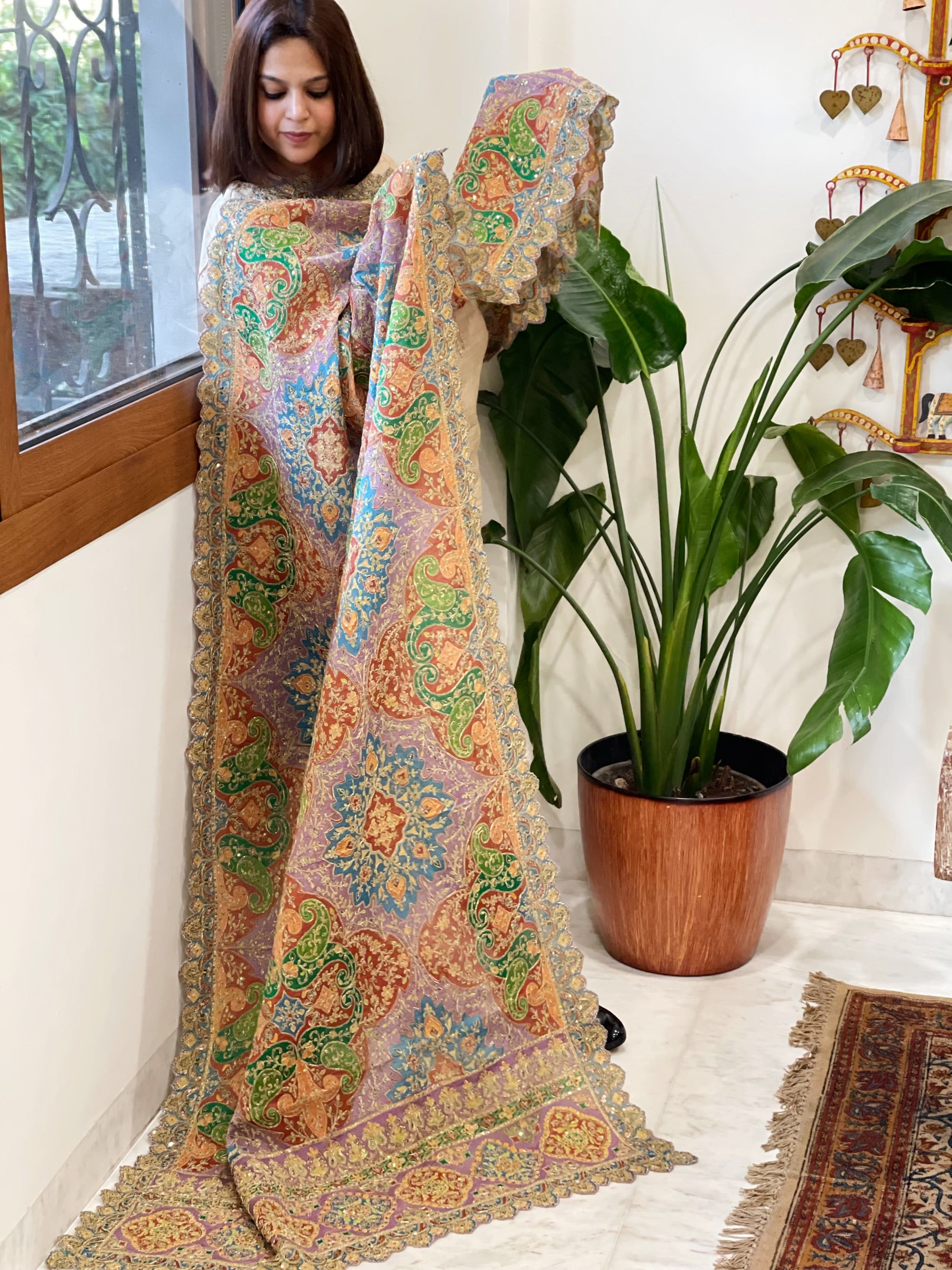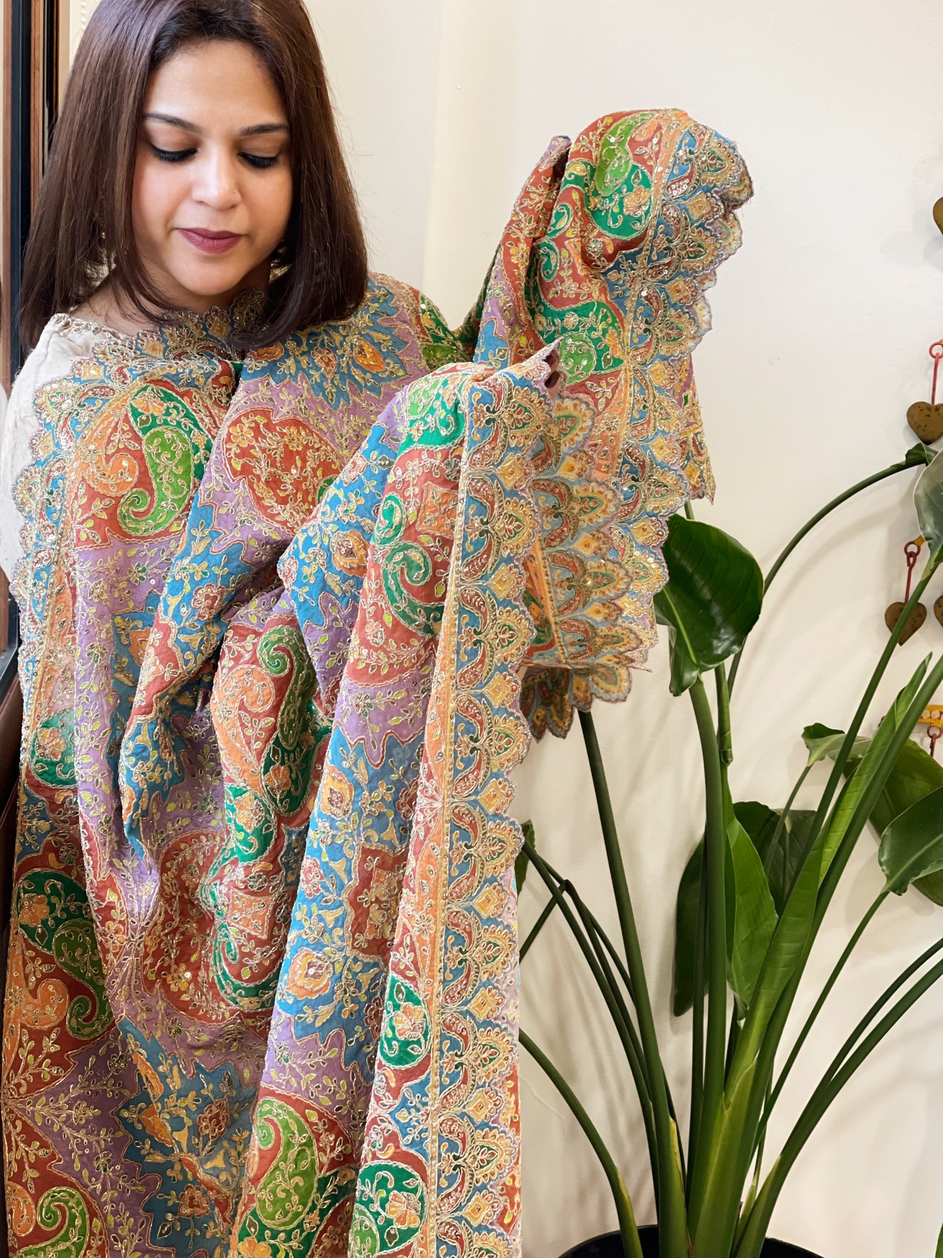 Elevate your ethnic ensemble with this exquisite Chinon Dupatta, featuring intricate aari embroidery that adds a touch of elegance and opulence. making it an ideal accessory for festive occasions and royal celebrations.
