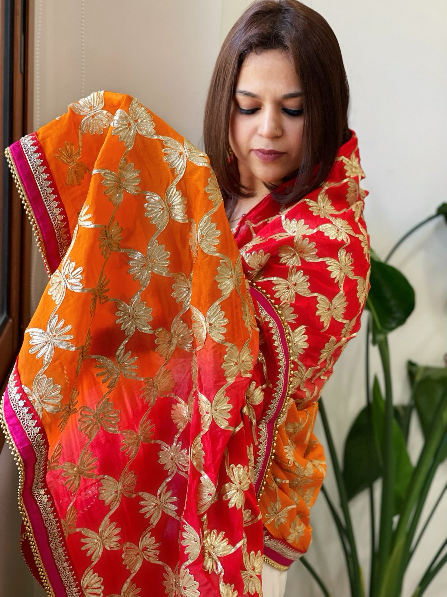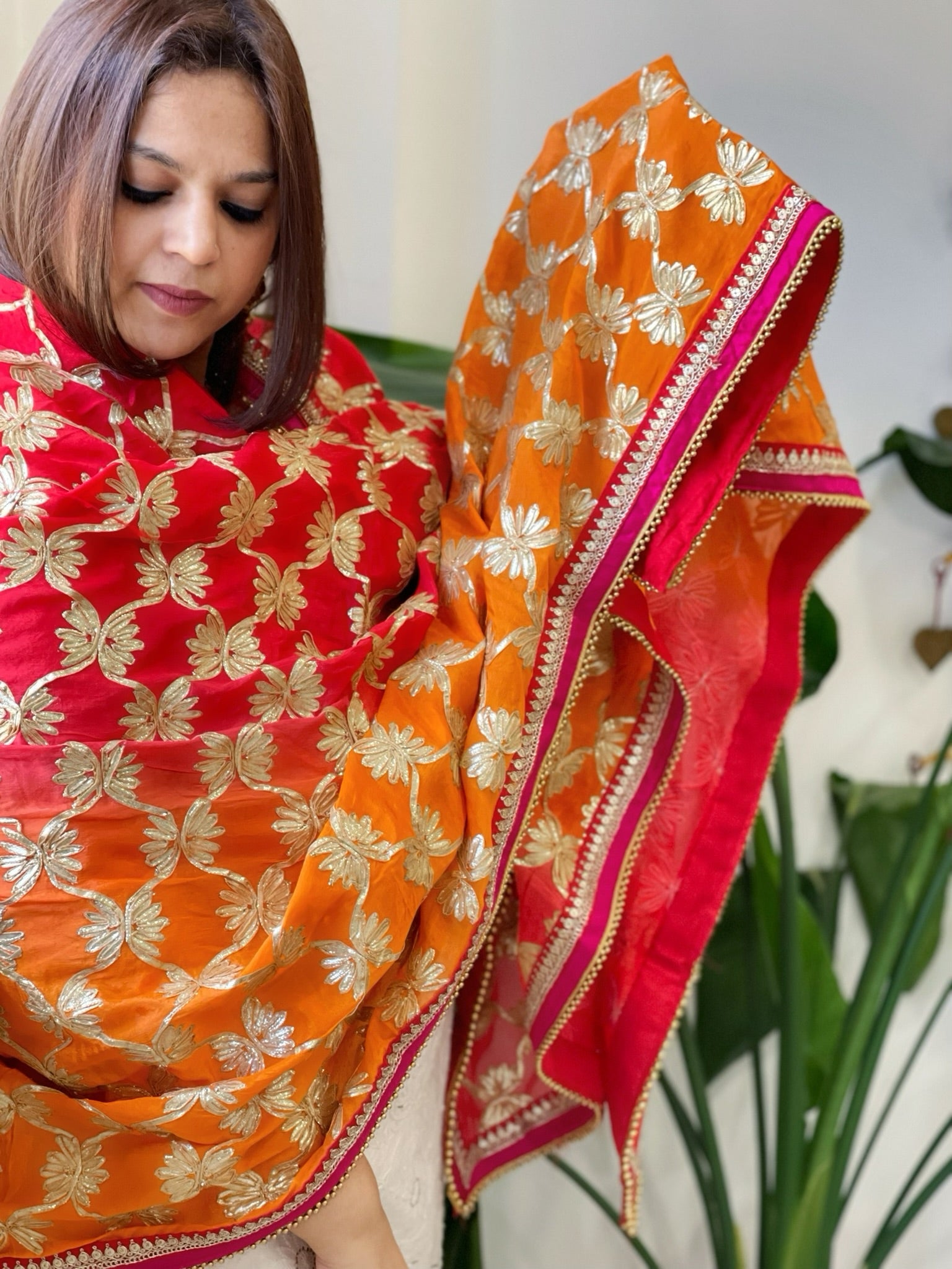 Red , Orange Chinon Dupatta with Gota Lace Work