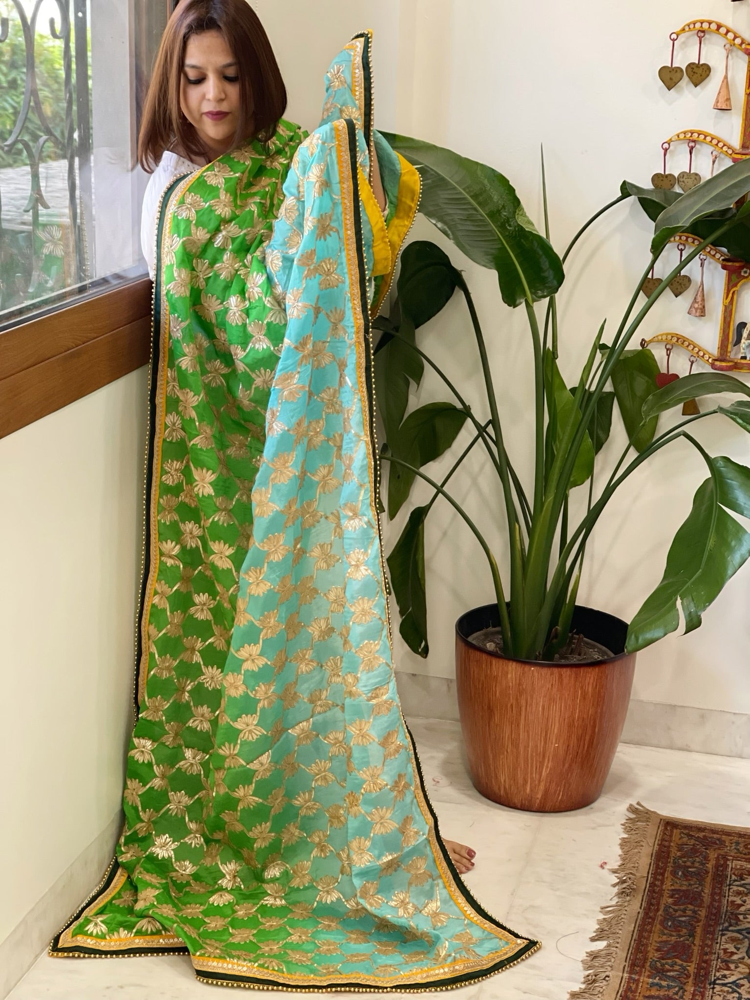 Elevate your festive wardrobe with this Chinon Dupatta featuring intricate Gota lace work. Its lightweight fabric and detailed embellishments make it an ideal choice for Karvachauth celebrations and other special occasions, adding elegance and a traditional touch to your ensemble.