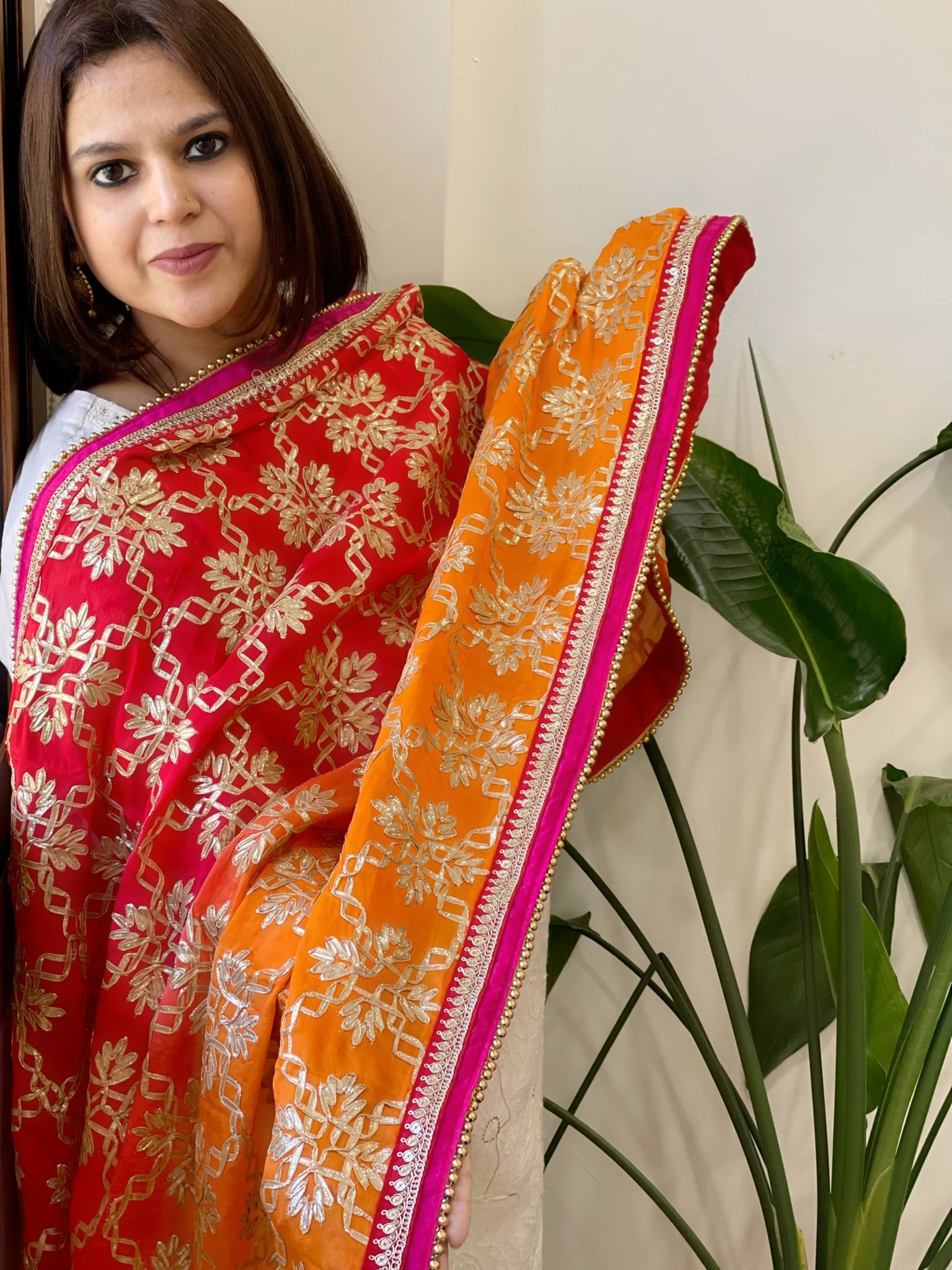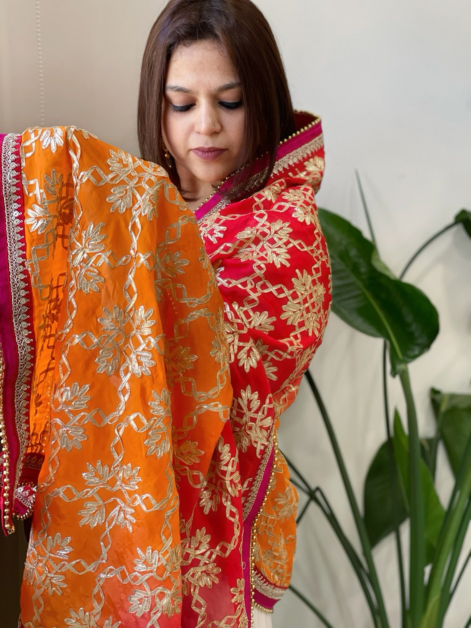 Orange, Red Chinon Dupatta with Gota Lace Work