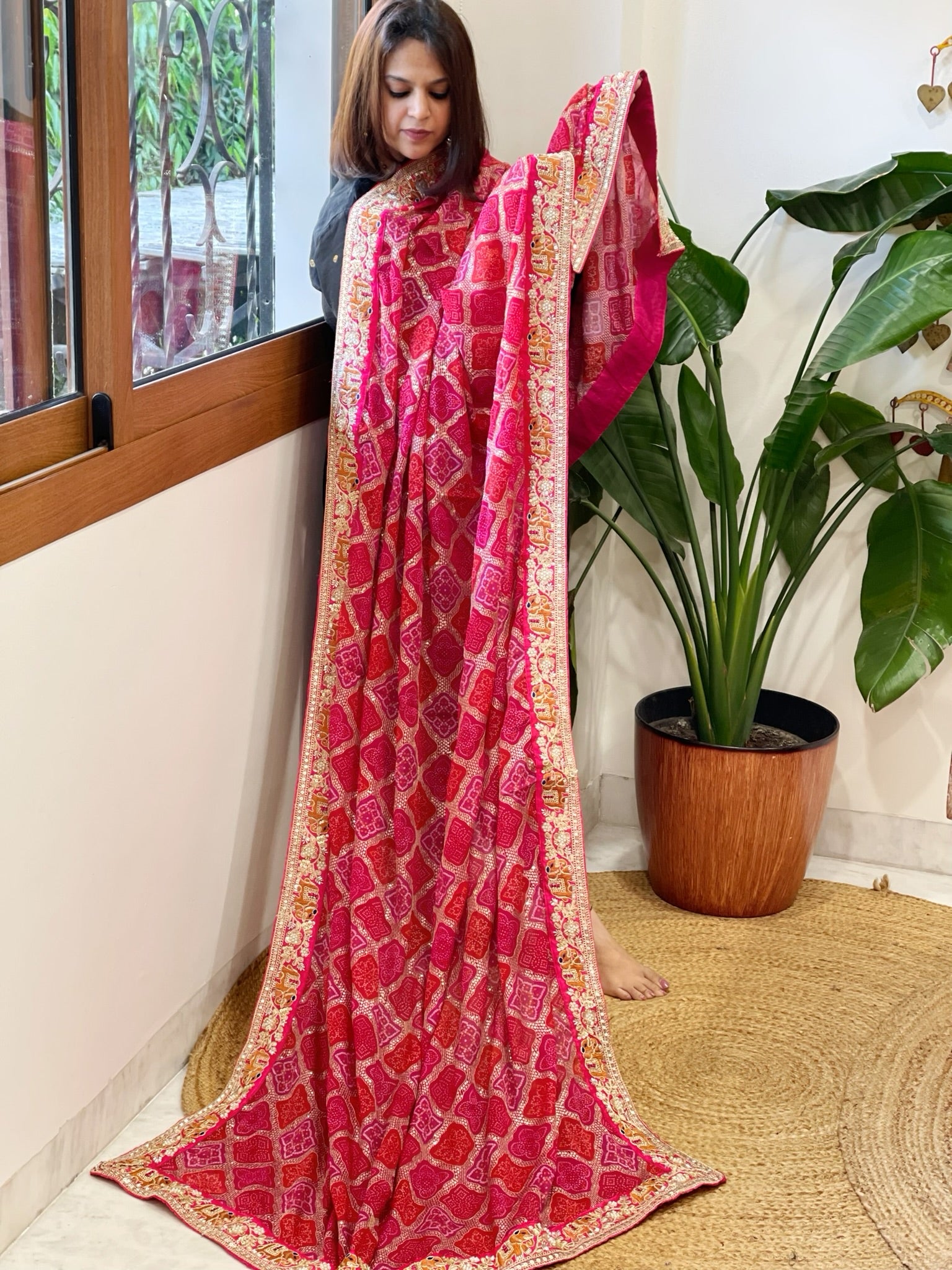 Red and Pink Chinon Printed Bandhej Dupatta with Thread, Sequin and Pearl Embroidery. The printed base is elevated with embroidery featuring lustrous threads, delicate sequins, and lustrous pearls that catch light beautifully. Perfect for weddings and special occassions.