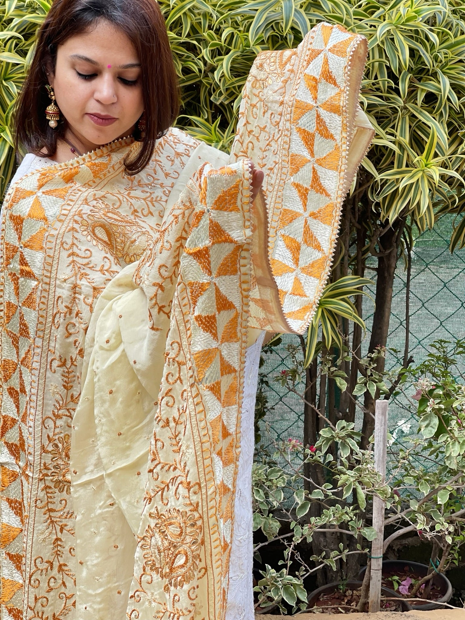 This Handmade Phulkari Dupatta is a beautiful and unique piece of art. Made with intricate gotapatti handwork on pure Chinon, it showcases the authentic craft from Punjab.