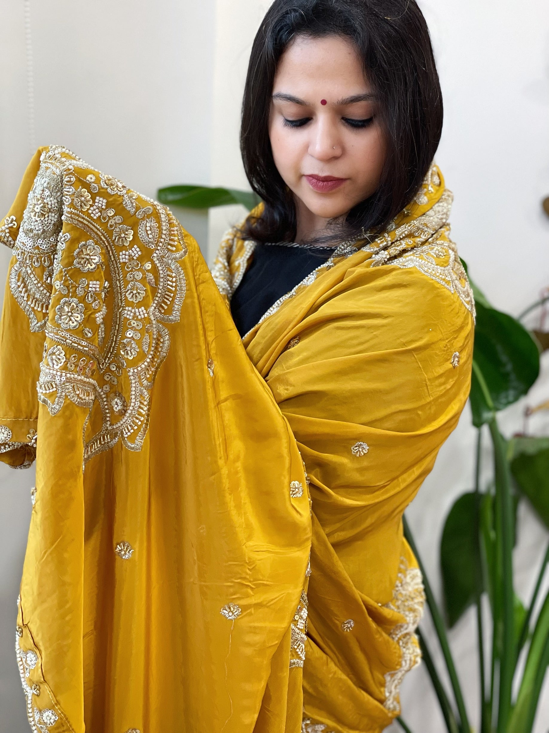 This gorgeous Crepe Dupatta is embellished with pearl, cut daana, intricate gold thread and sequin embroidery. The perfect addition to any festive outfit.