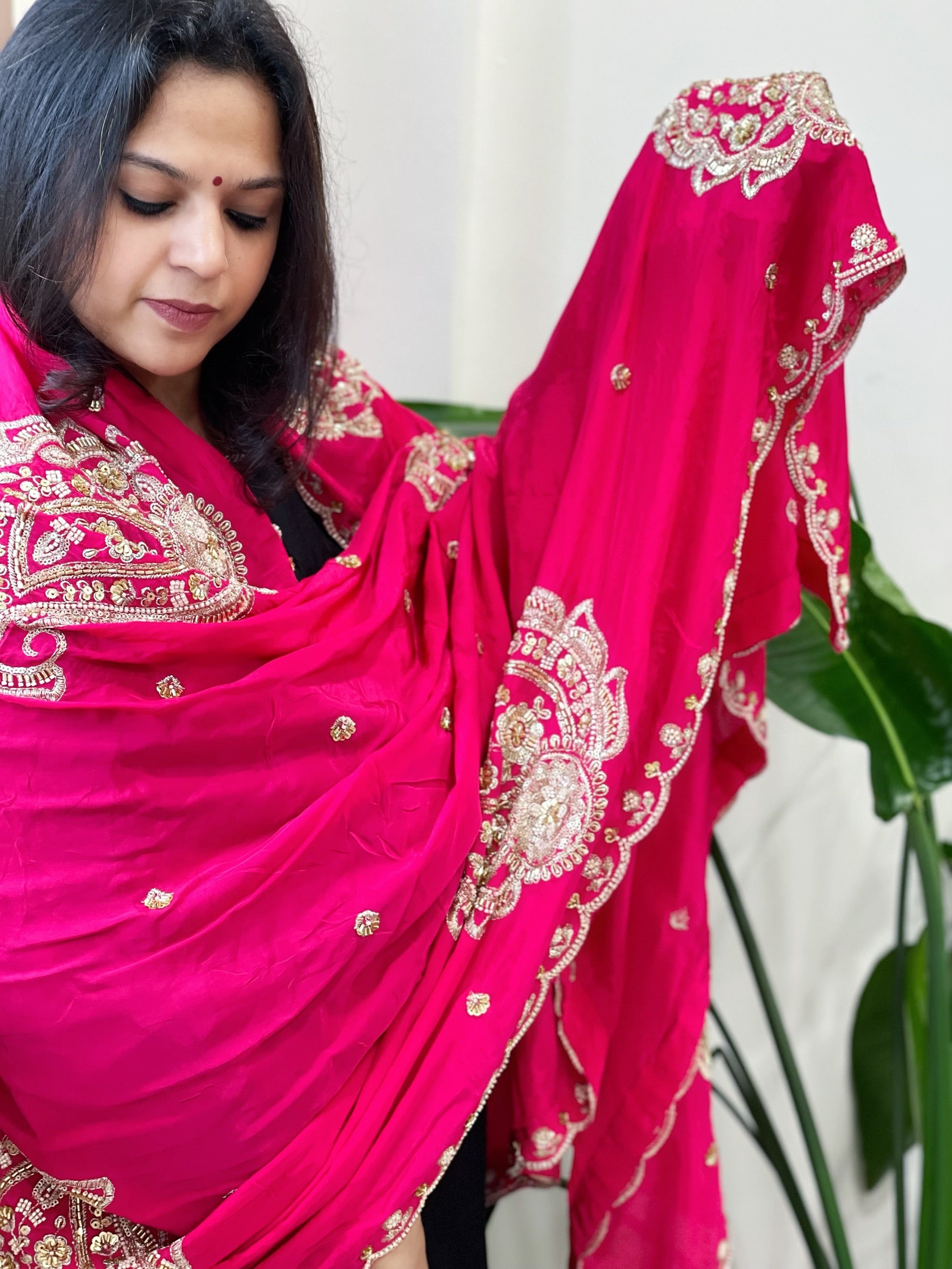 This gorgeous Crepe Dupatta is embellished with pearl, cut daana, intricate gold thread and sequin embroidery. The perfect addition to any festive outfit.