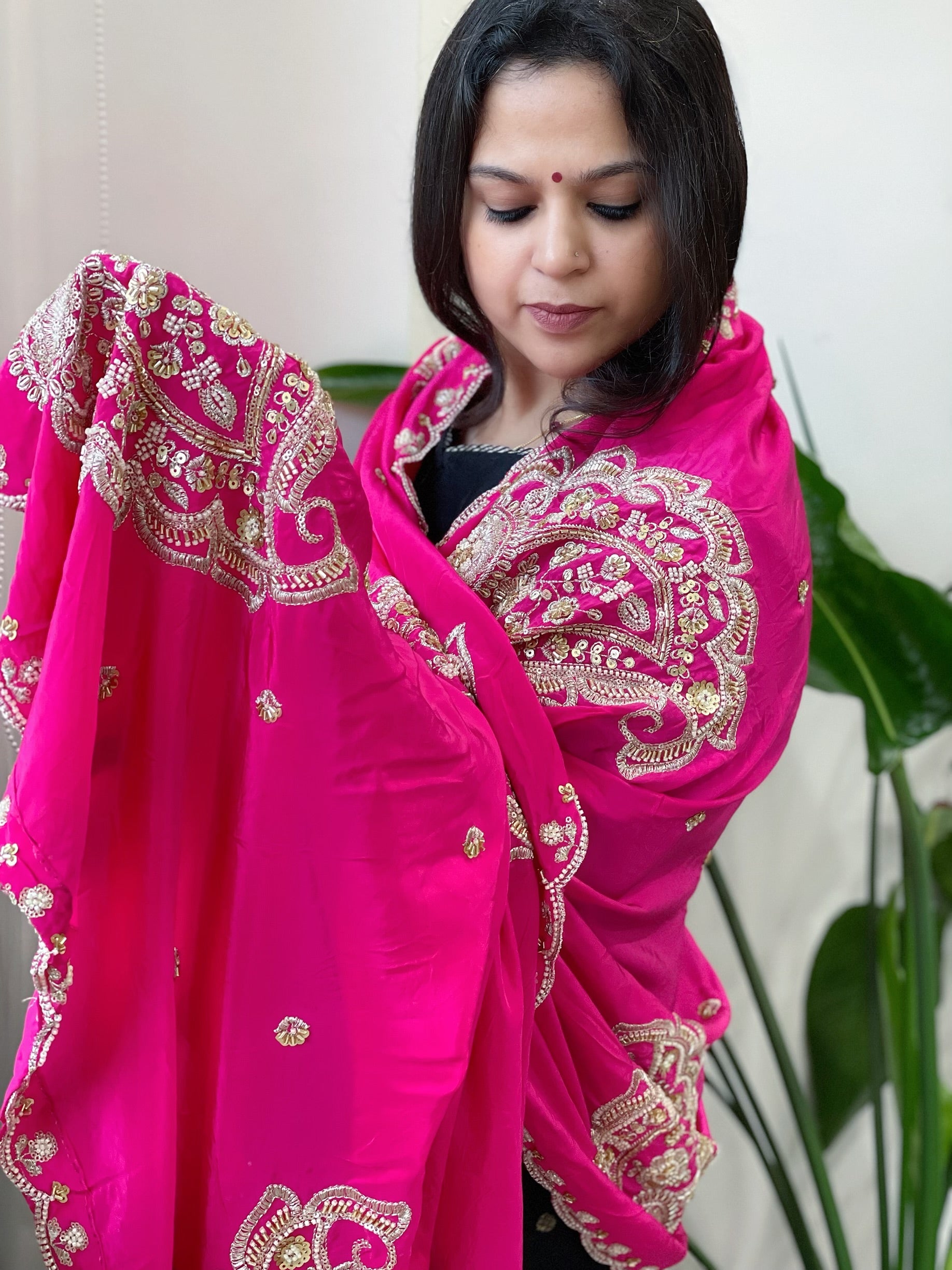 This gorgeous Crepe Dupatta is embellished with pearl, cut daana, intricate gold thread and sequin embroidery. The perfect addition to any festive outfit.