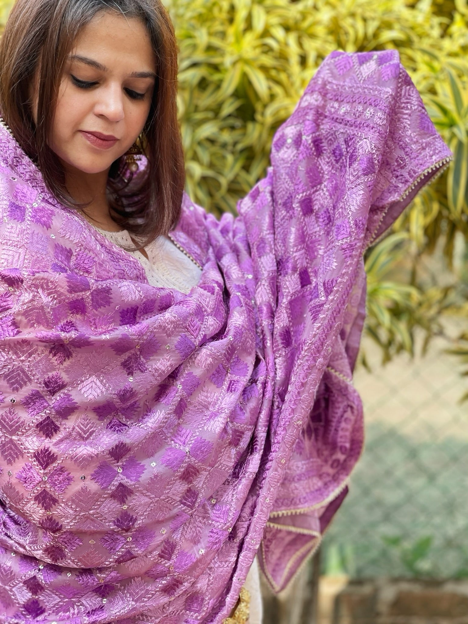Lilac Designer Phulkari Dupatta in Chinon
