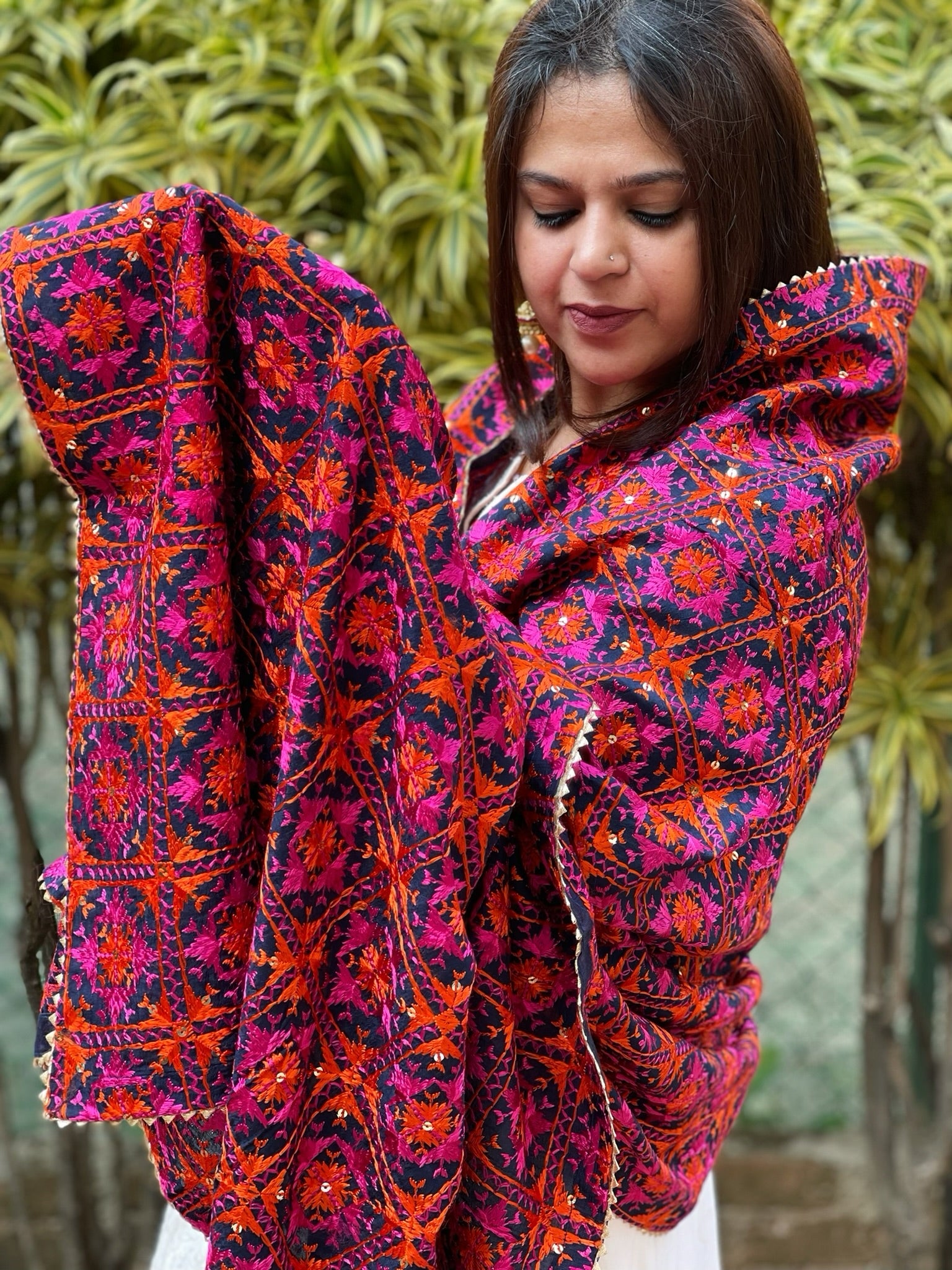 Expertly crafted in Punjab, this designer Phulkari Dupatta is a timeless piece made from pure Chinon fabric. The intricate Phulkari design adds a versatile touch to any outfit.