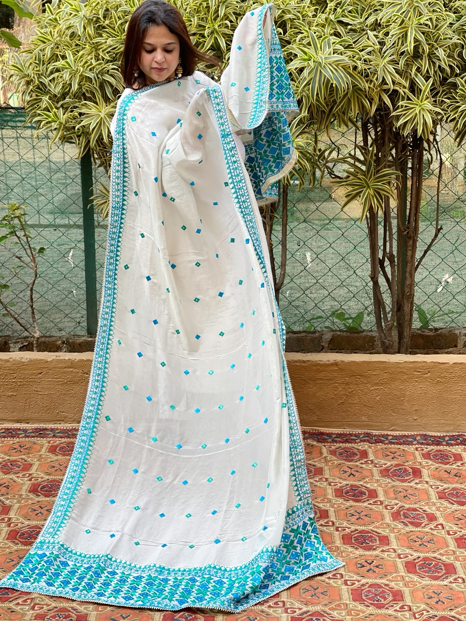 Expertly crafted in Punjab, this designer Phulkari Dupatta is a timeless piece made from pure Chinon fabric. The intricate Phulkari design adds a versatile touch to any outfit.
