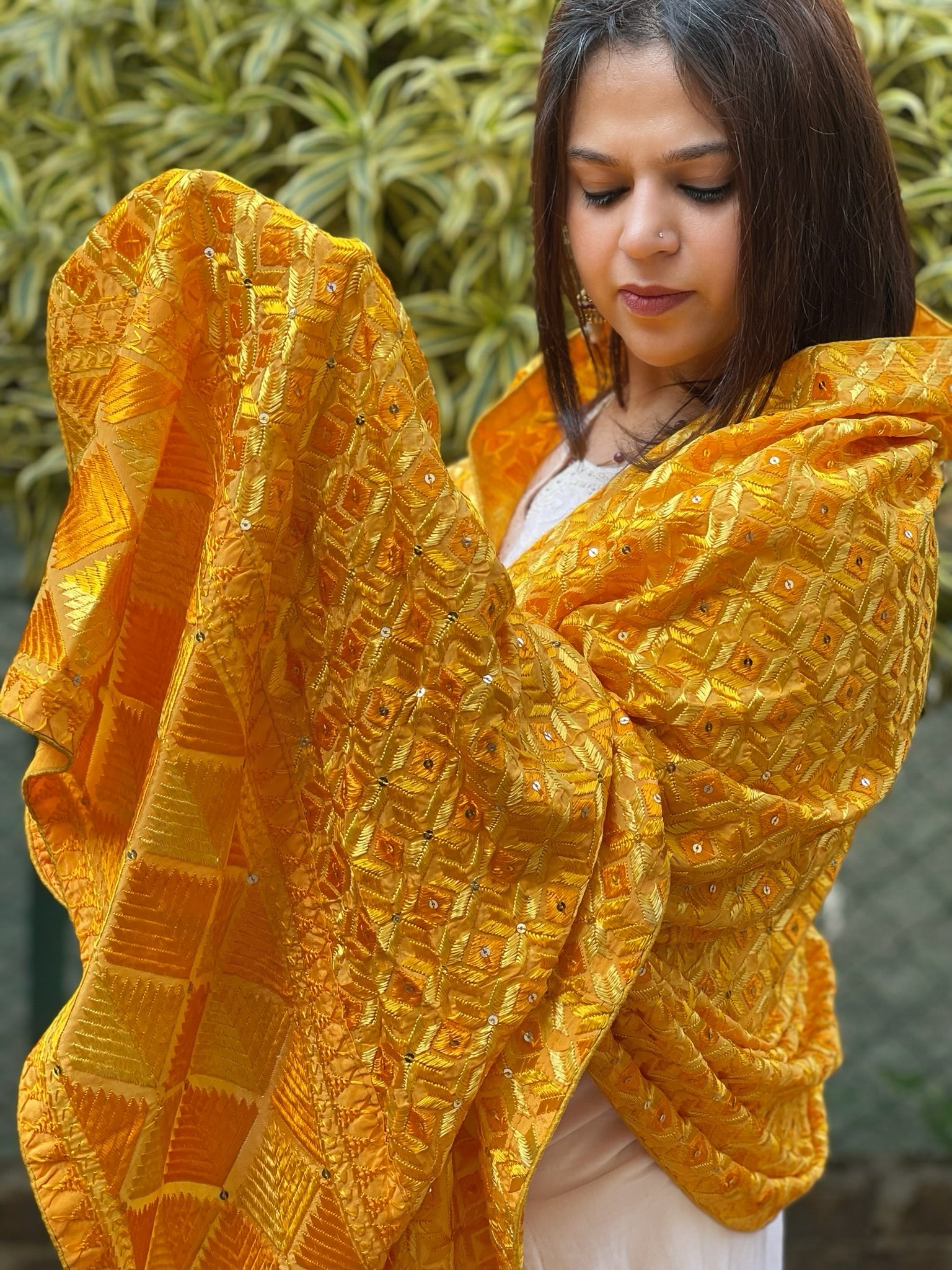 Expertly crafted in Punjab, this designer Phulkari Dupatta is a timeless piece made from pure Chinon fabric. The intricate Phulkari design adds a versatile touch to any outfit.
