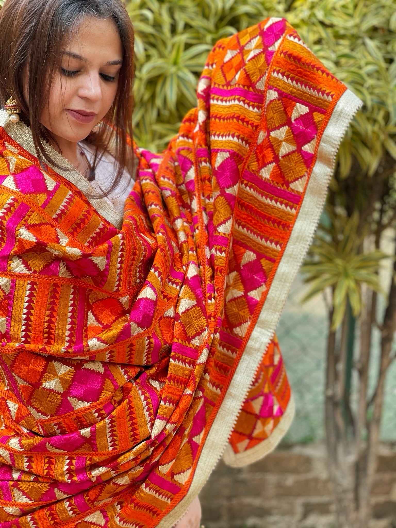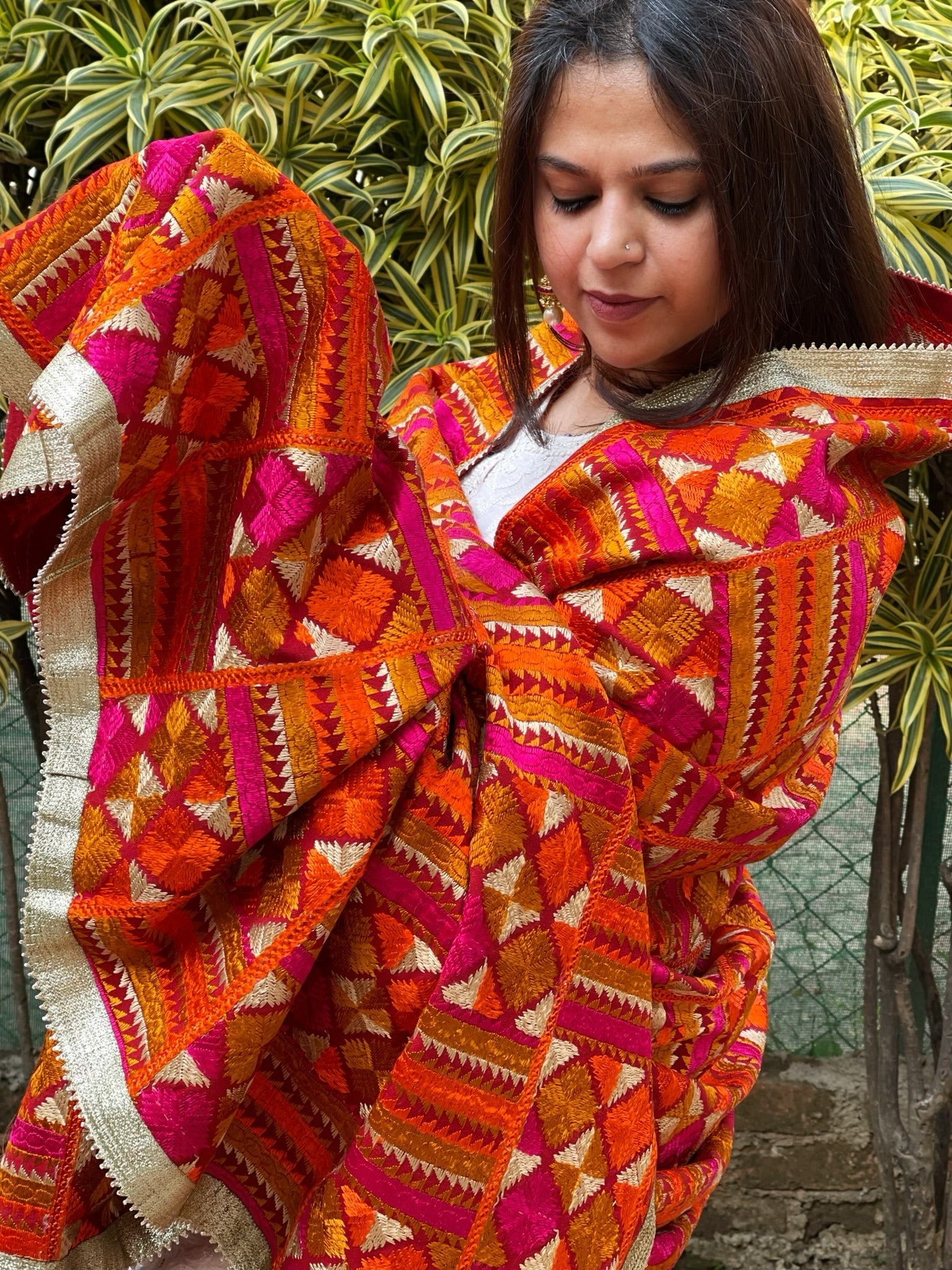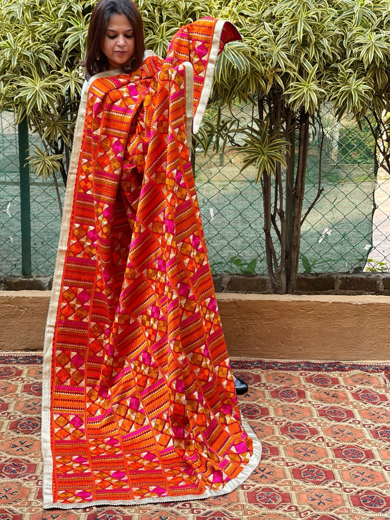 Orangish Pink Designer Phulkari Dupatta in Khaddar Cotton