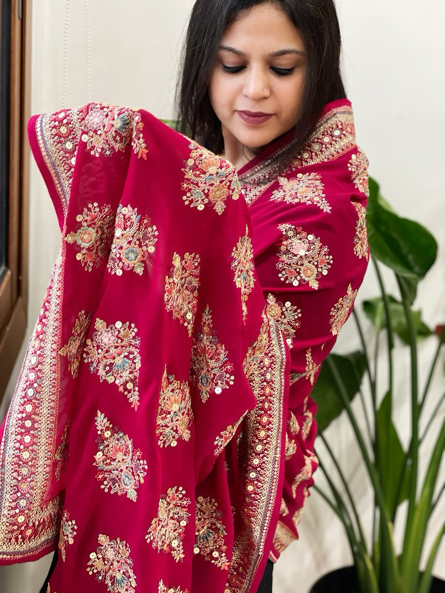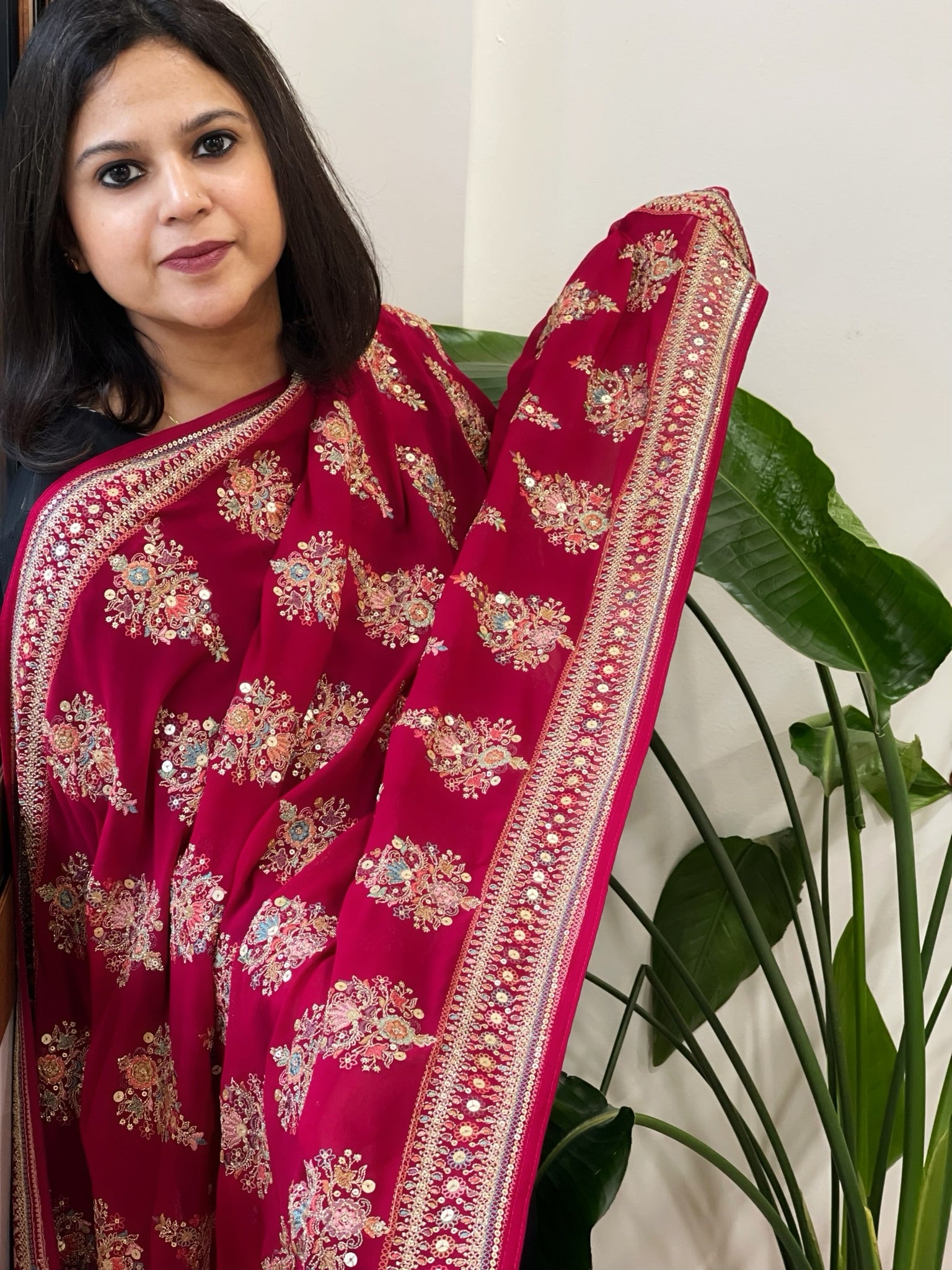 Magenta Pink Georgette Dupatta with Thread & Sequin Embroidered Buttas and Border