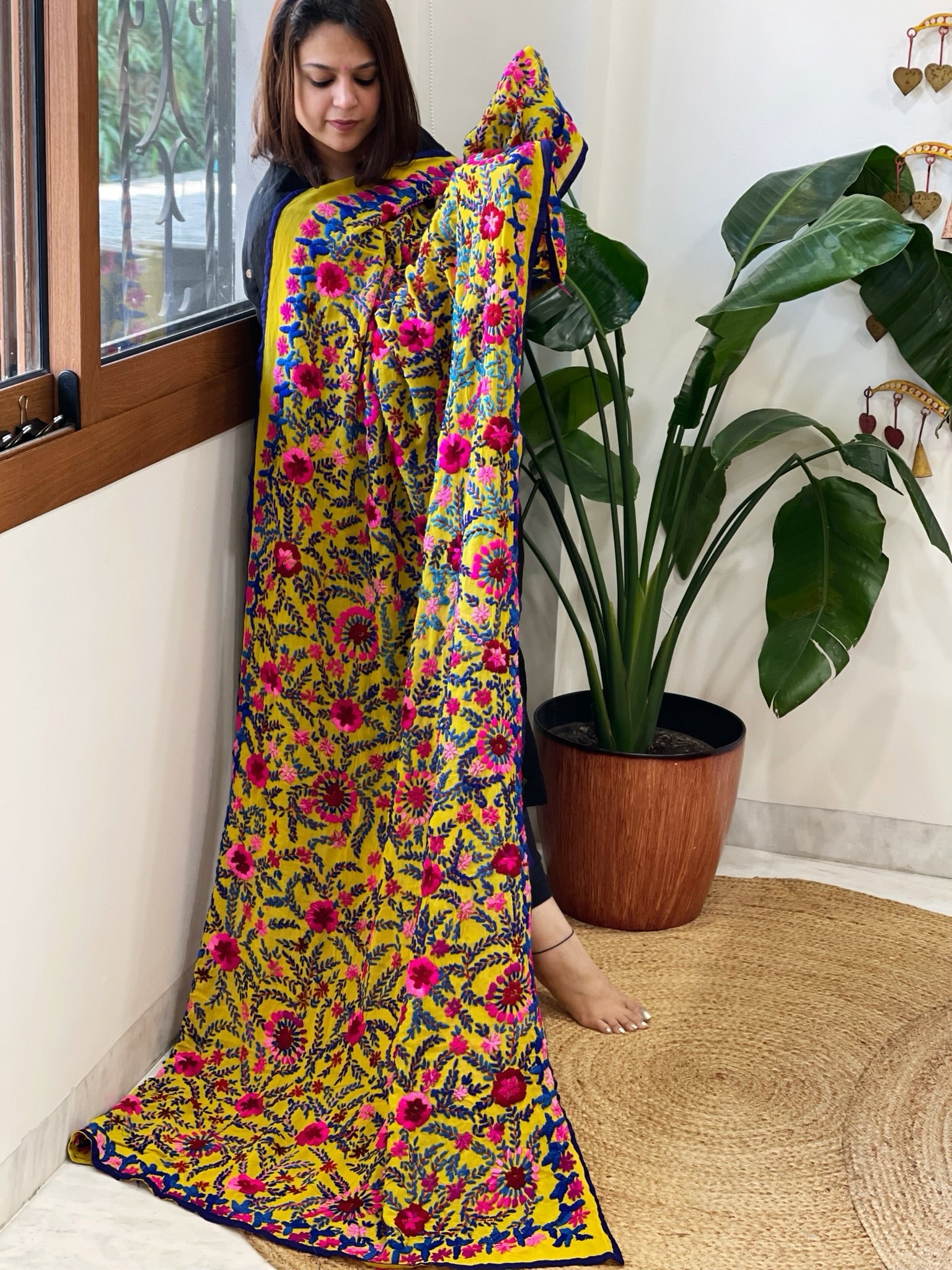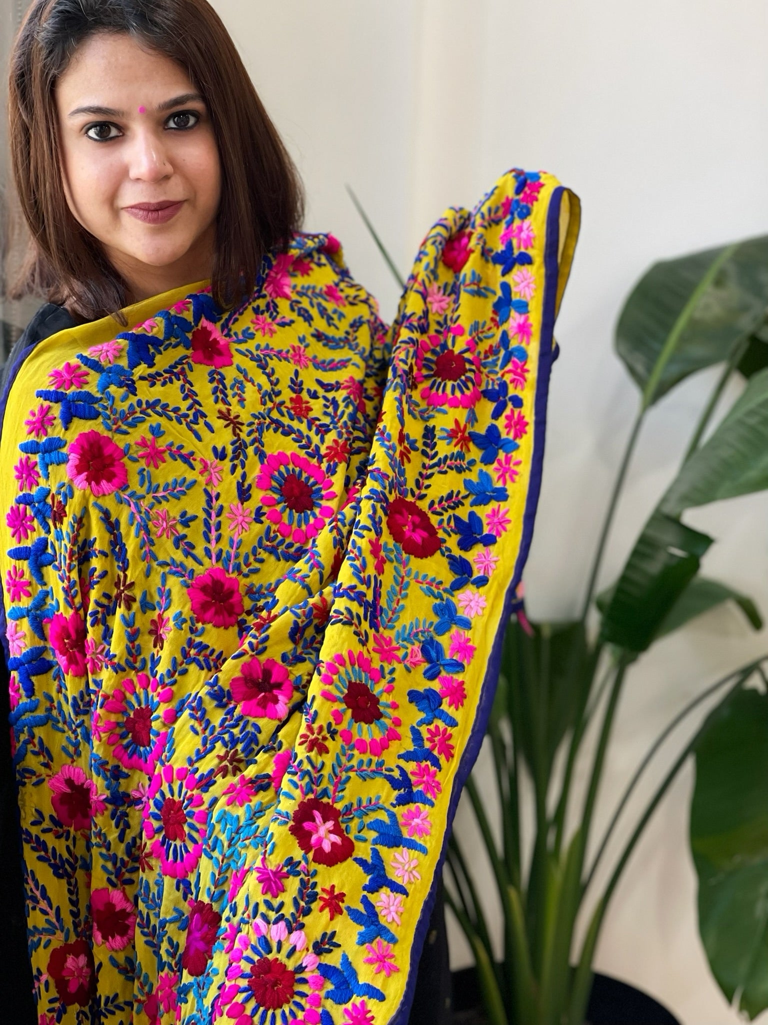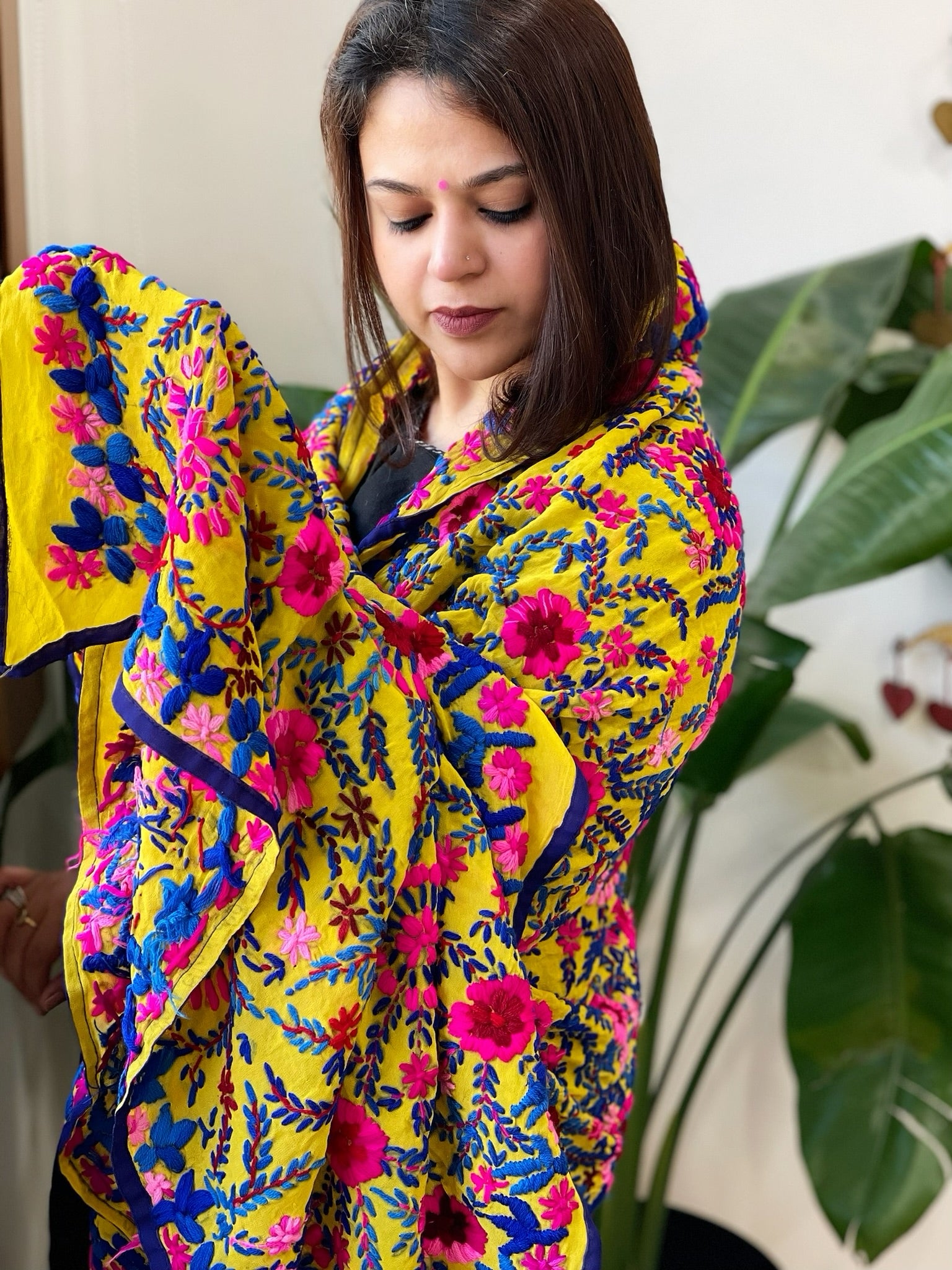 Expertly crafted, this georgette dupatta showcases stunning woolen thread hand work. Perfect for the wedding season. Very versatile and vibrant embroidered dupatta