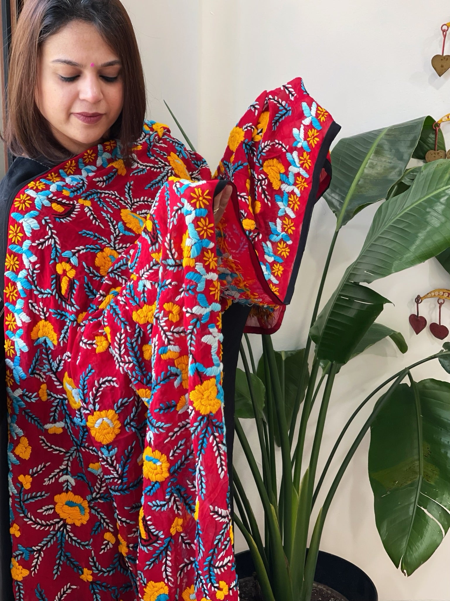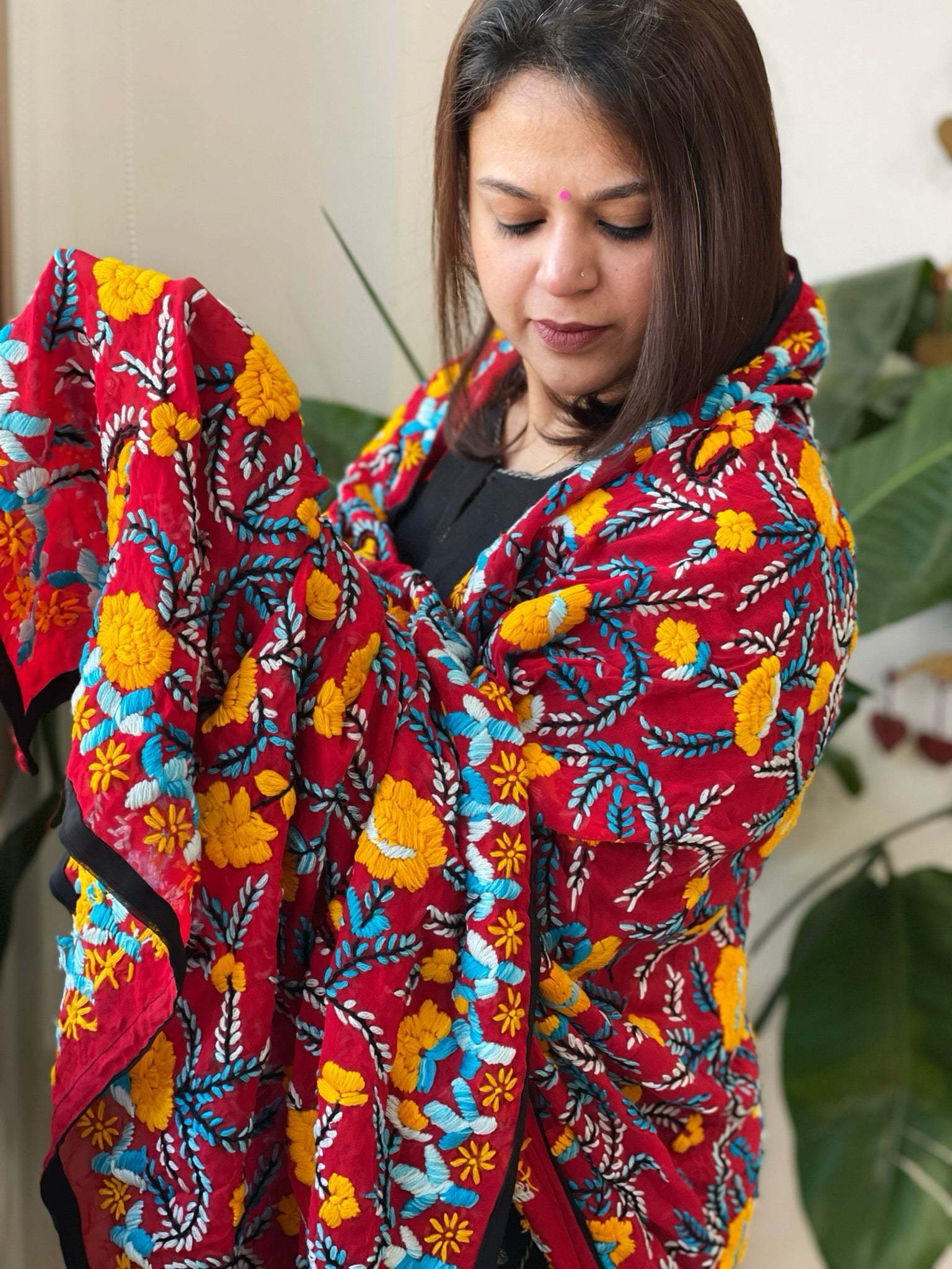 Expertly crafted, this georgette dupatta showcases stunning woolen thread hand work. Perfect for the wedding season. Very versatile and vibrant embroidered dupatta