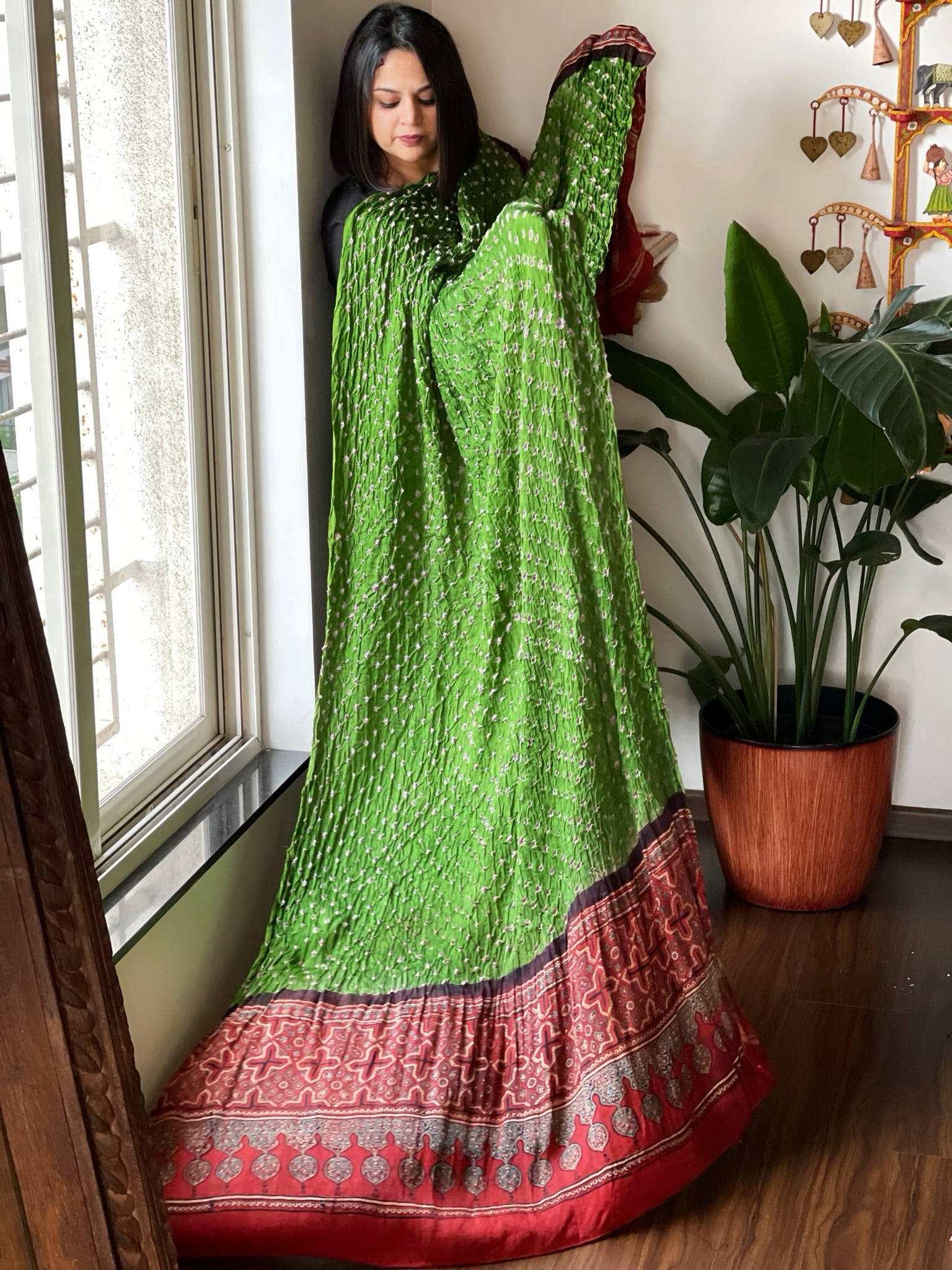 Elegant bandhani and ajrakh dupatta in natural modal silk. Perfect blend of two handcrafted arts. Versatile and Classic.