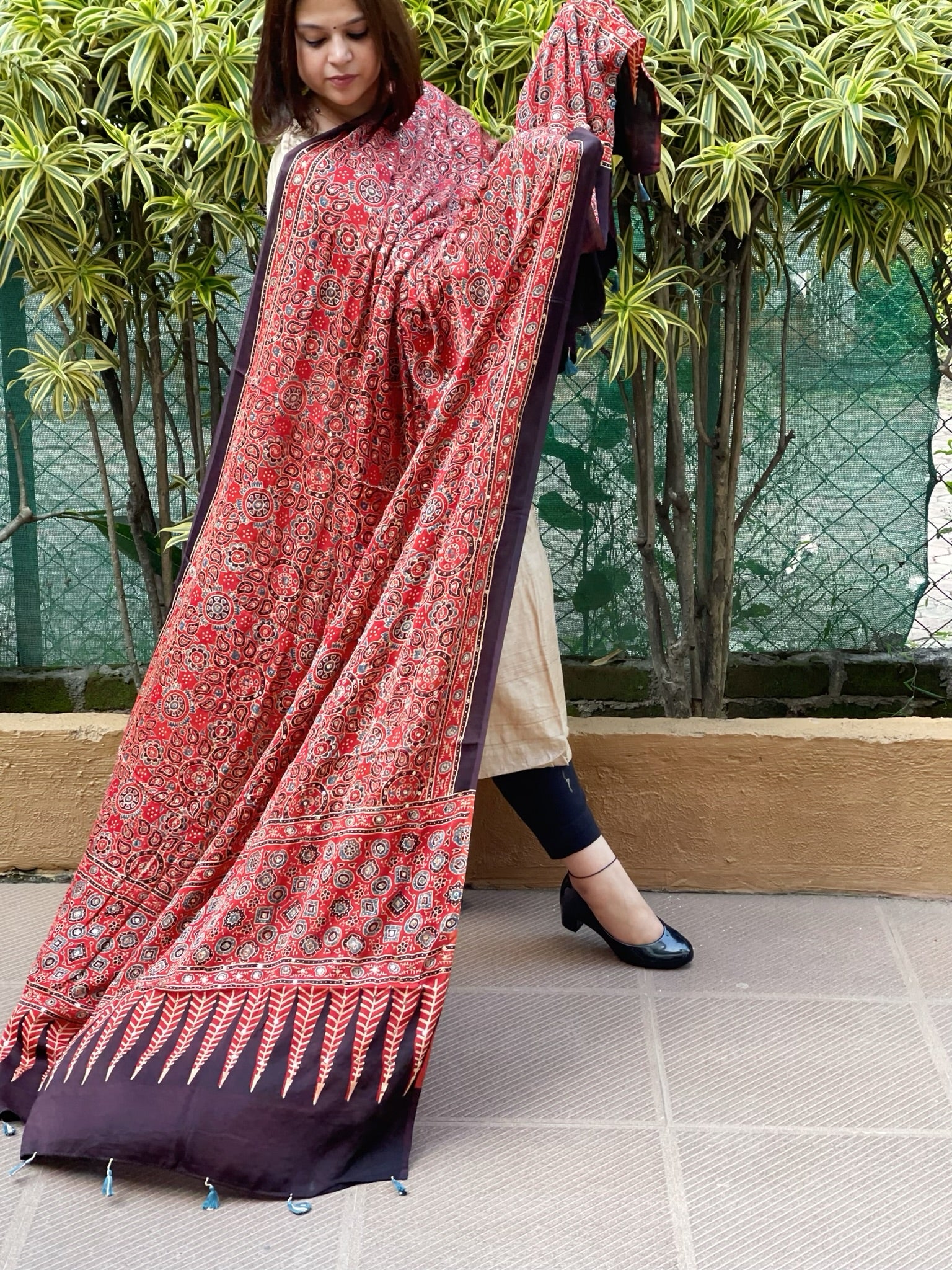 This Handblock Printed Ajrakh Dupatta with Mukaish Handwork showcases traditional craftsmanship with intricate handblock printing and detailed metallic mukaish embellishments. Made with fine fabric, it offers both elegance and durability, making it a perfect accessory to elevate your ethnic ensemble with timeless artistry.