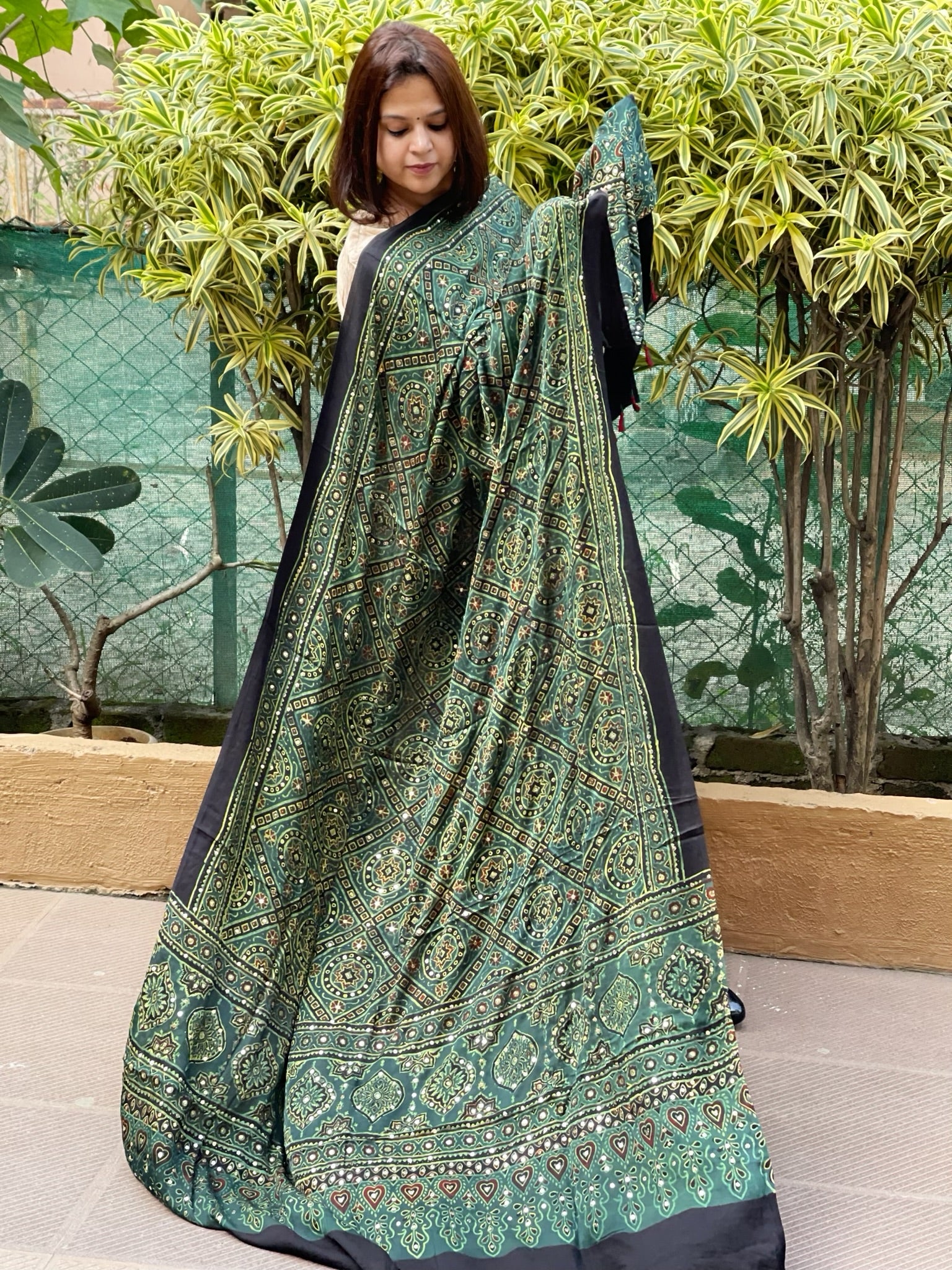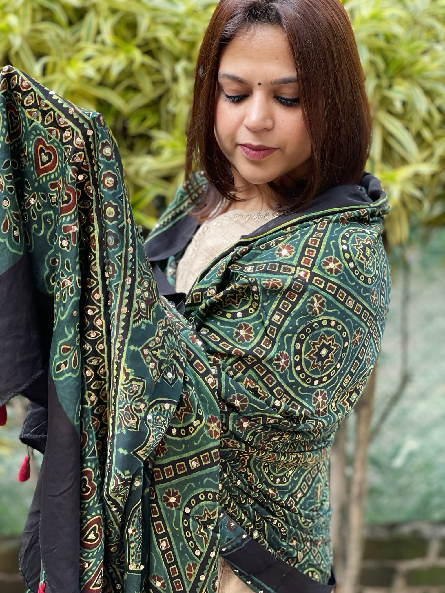 This Handblock Printed Ajrakh Dupatta with Mukaish Handwork showcases traditional craftsmanship with intricate handblock printing and detailed metallic mukaish embellishments. Made with fine fabric, it offers both elegance and durability, making it a perfect accessory to elevate your ethnic ensemble with timeless artistry.