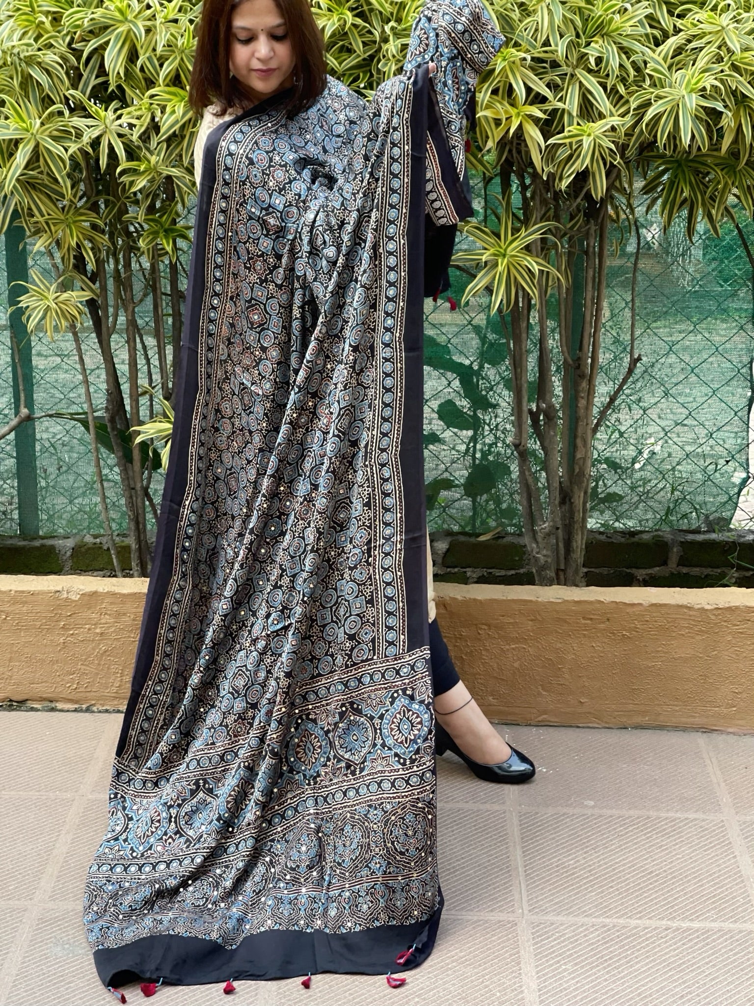 This Handblock Printed Ajrakh Dupatta with Mukaish Handwork showcases traditional craftsmanship with intricate handblock printing and detailed metallic mukaish embellishments. Made with fine fabric, it offers both elegance and durability, making it a perfect accessory to elevate your ethnic ensemble with timeless artistry.