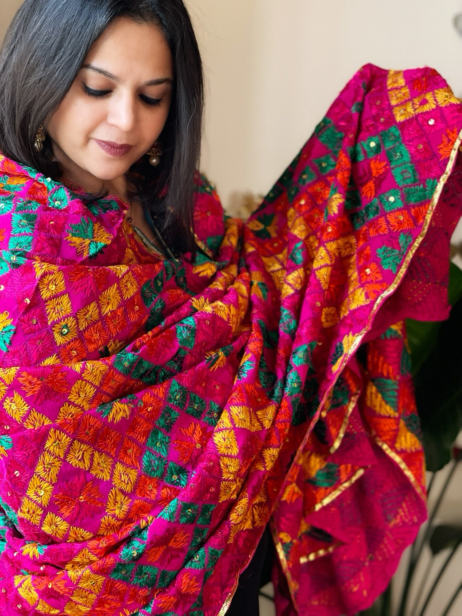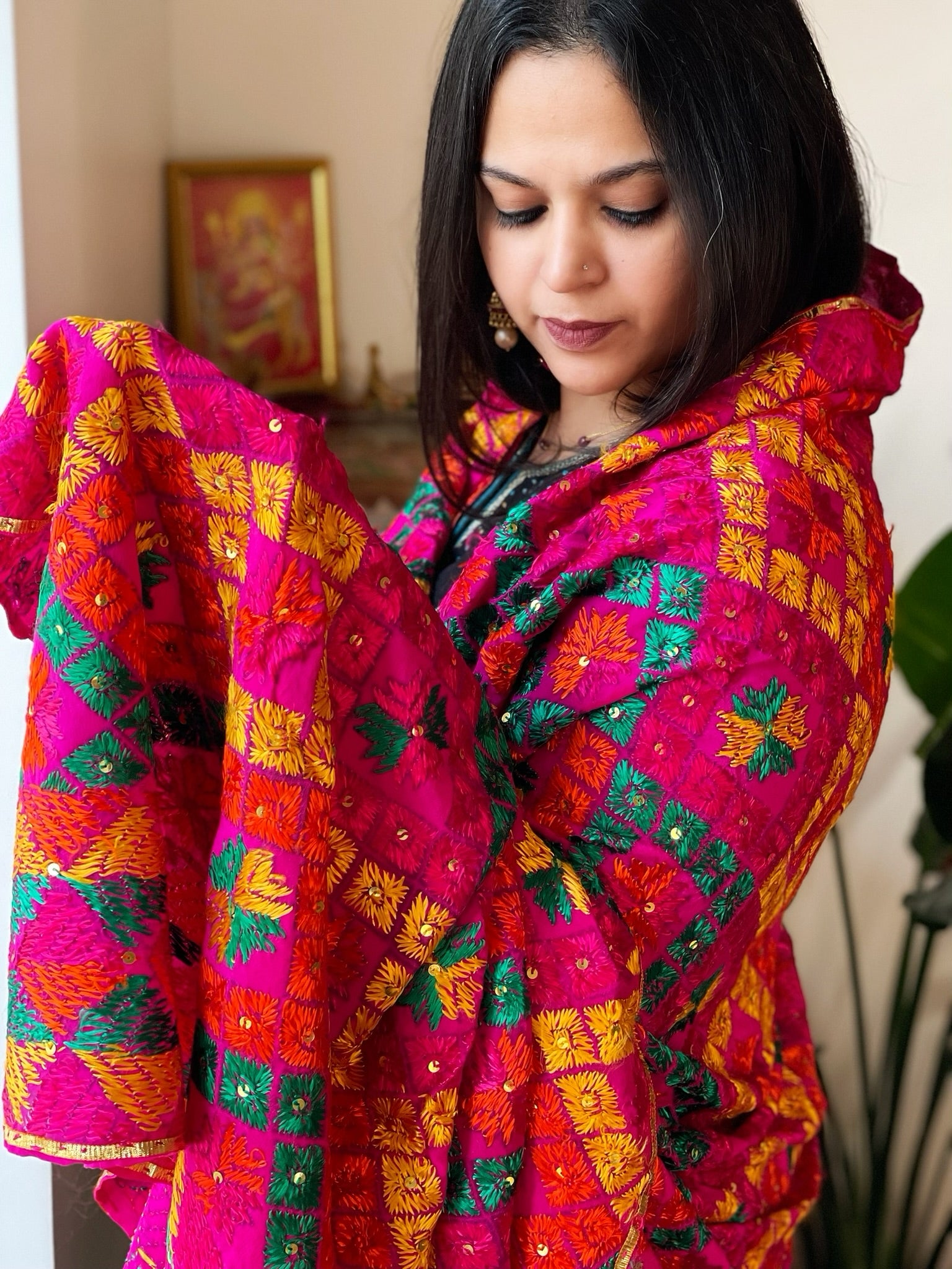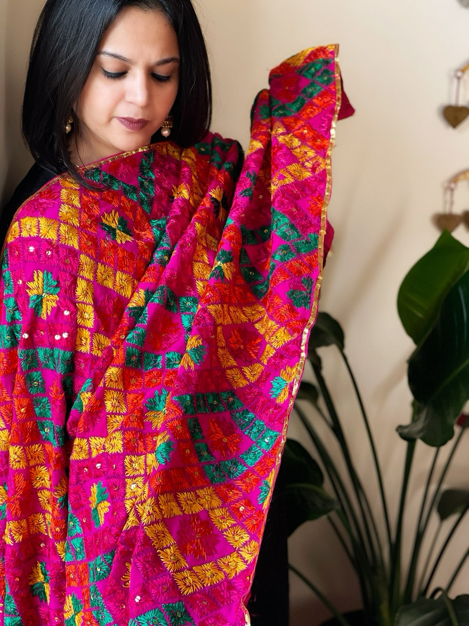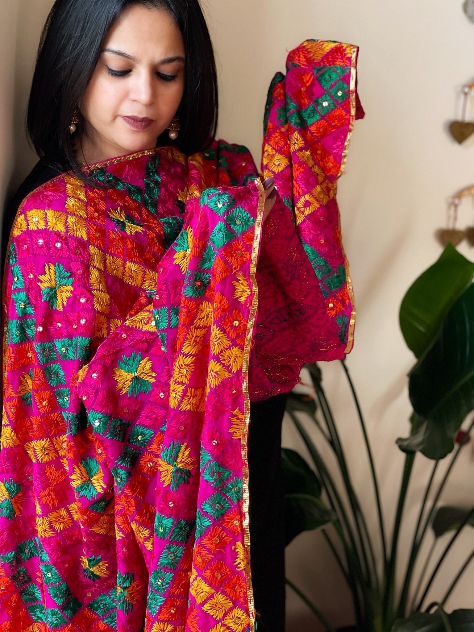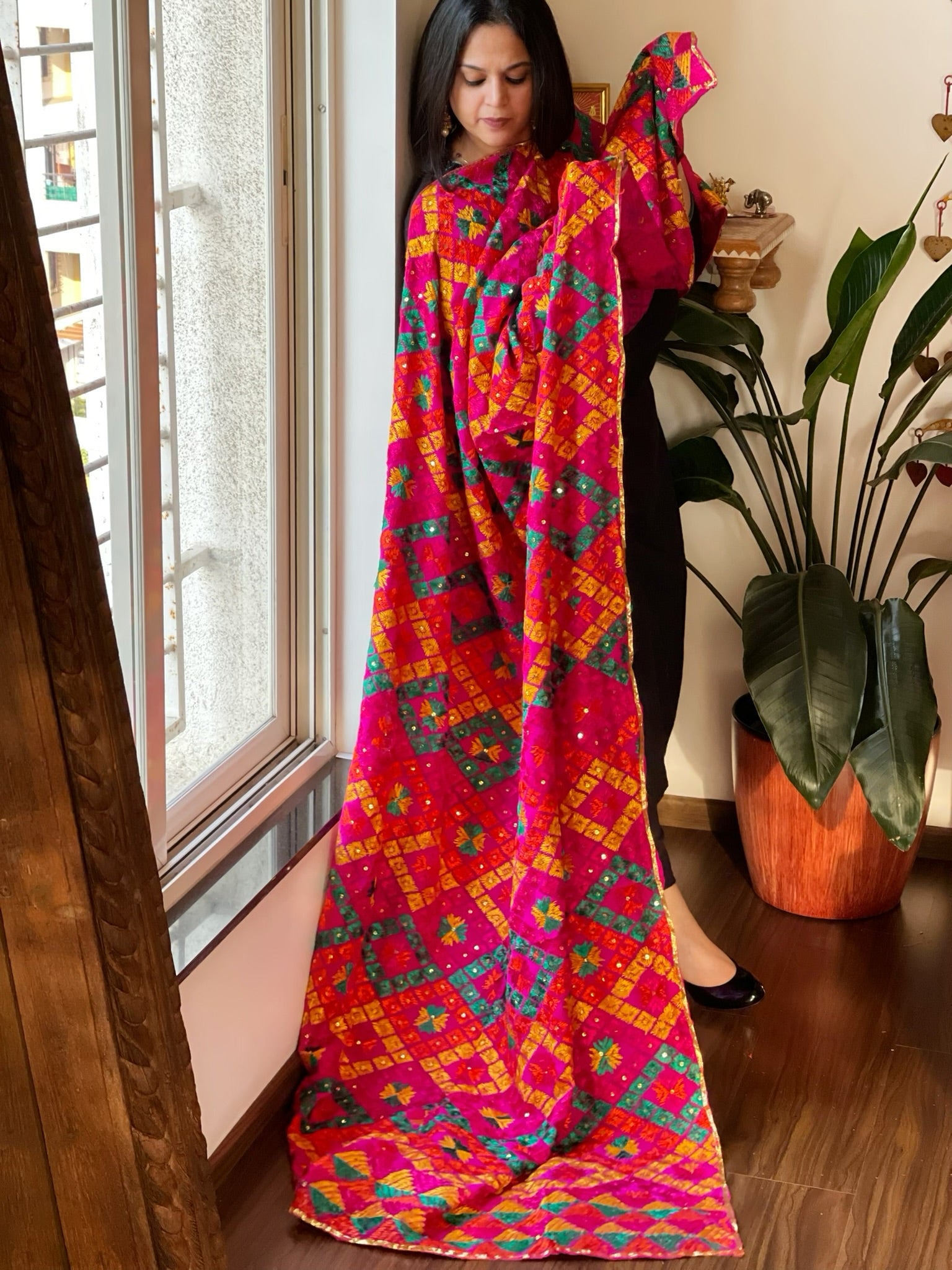 This Handmade Bagh Phulkari Dupatta is crafted in pure crepe, providing both authenticity and comfort for any occasion. Its vibrant design adds a festive touch to any outfit. Handmade with precision, these dupattas are a must-have for any fashion enthusiast.