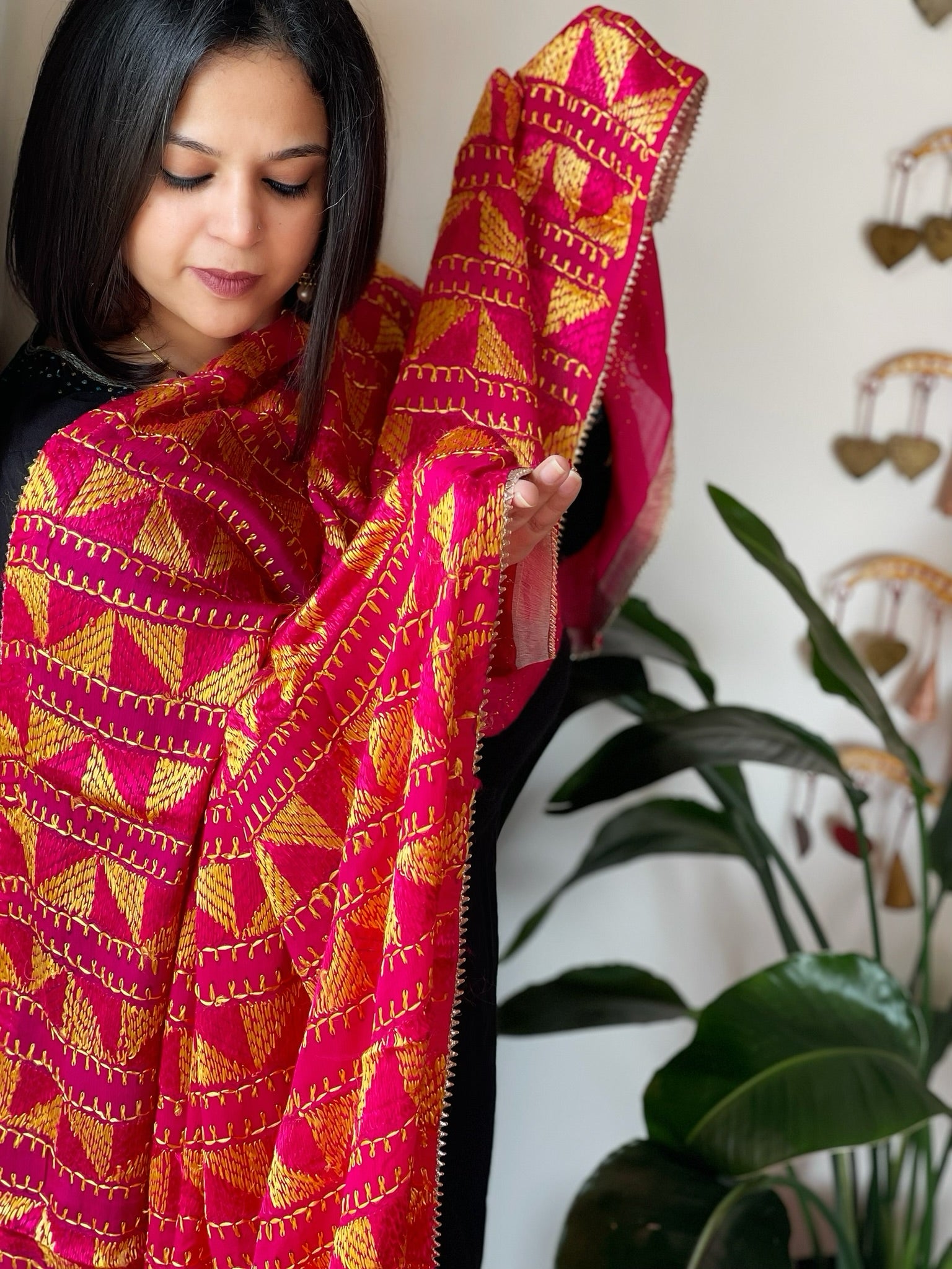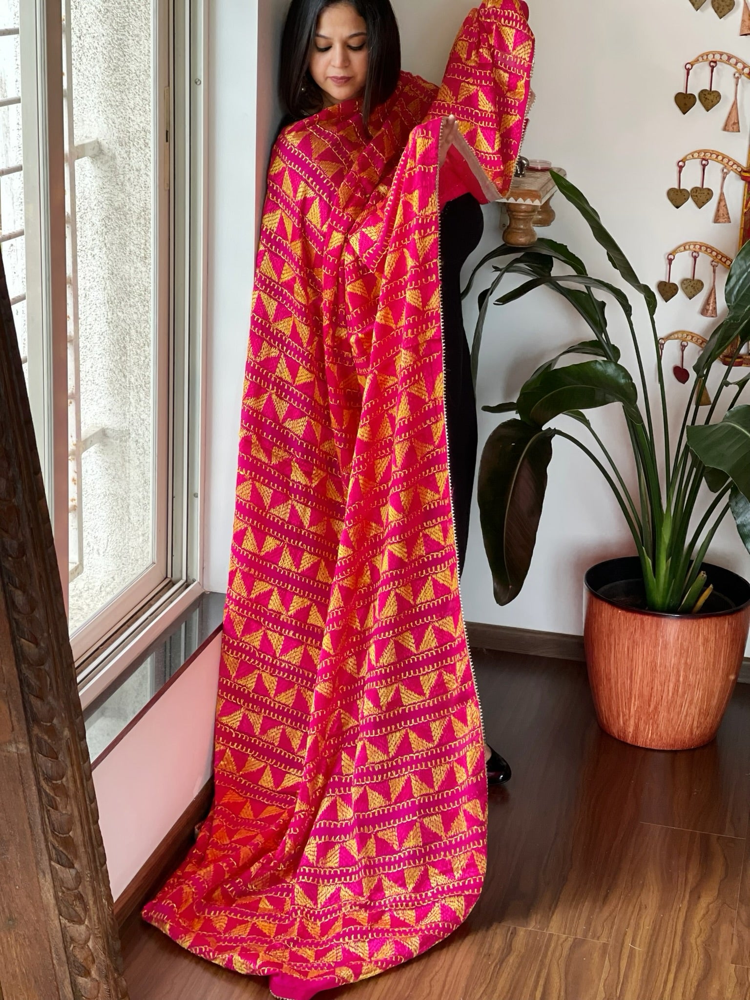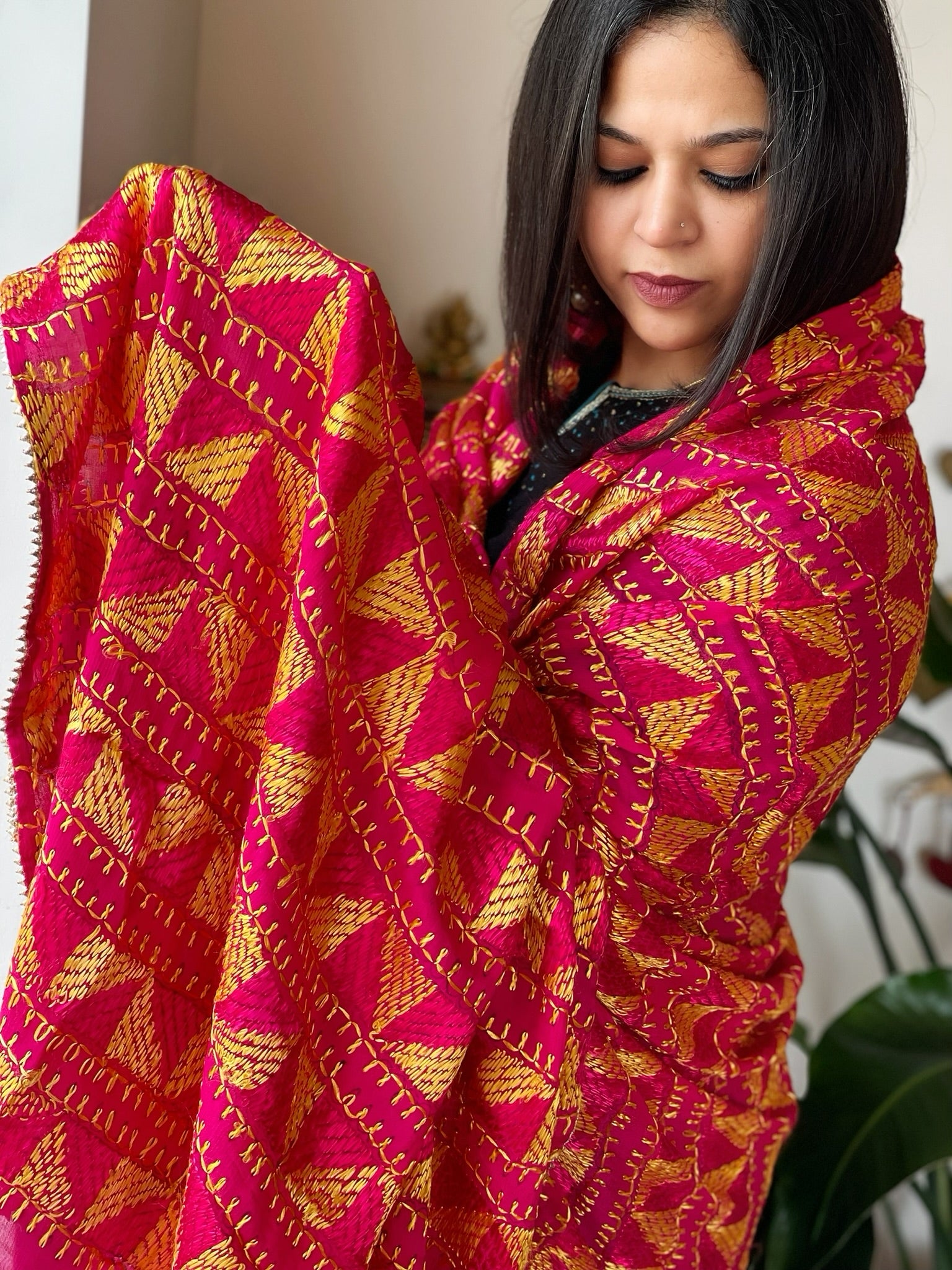 Expertly crafted in Punjab, this handmade designer Phulkari Dupatta is a timeless piece made from pure Chinon fabric. The intricate Phulkari design adds a versatile touch to any outfit.