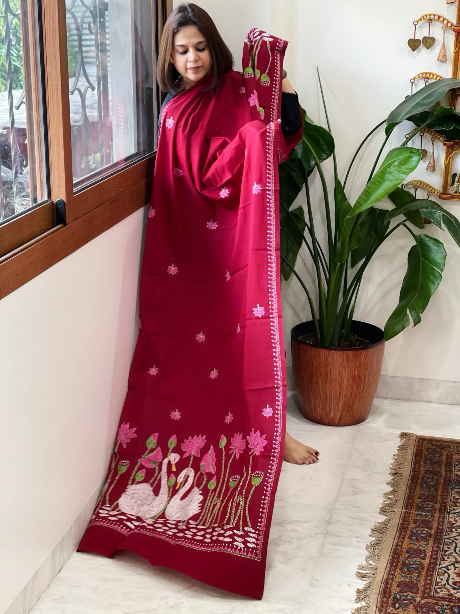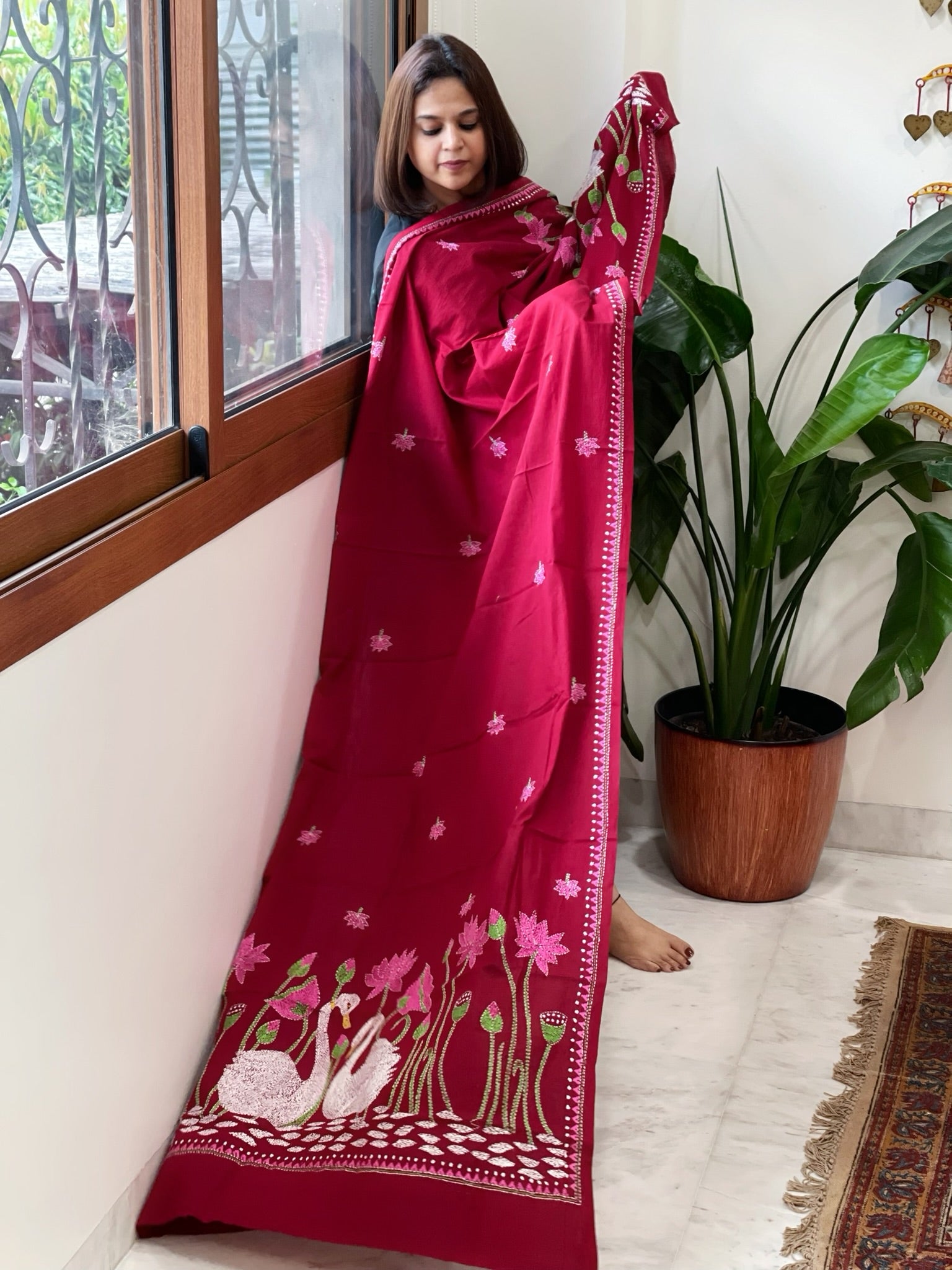 Deep Red Handmade Kantha Dupatta in Pure Cotton