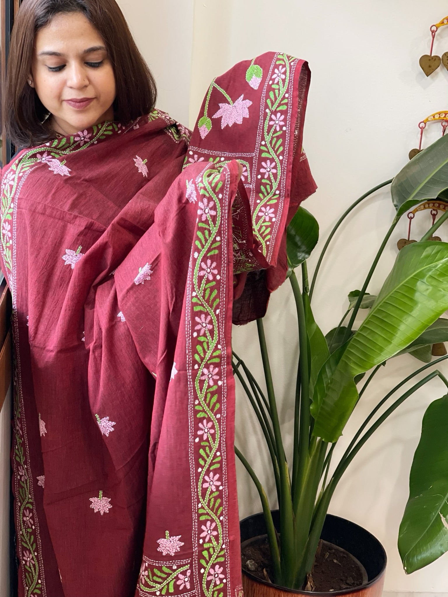 Maroon Handmade Kantha Dupatta in Pure Cotton