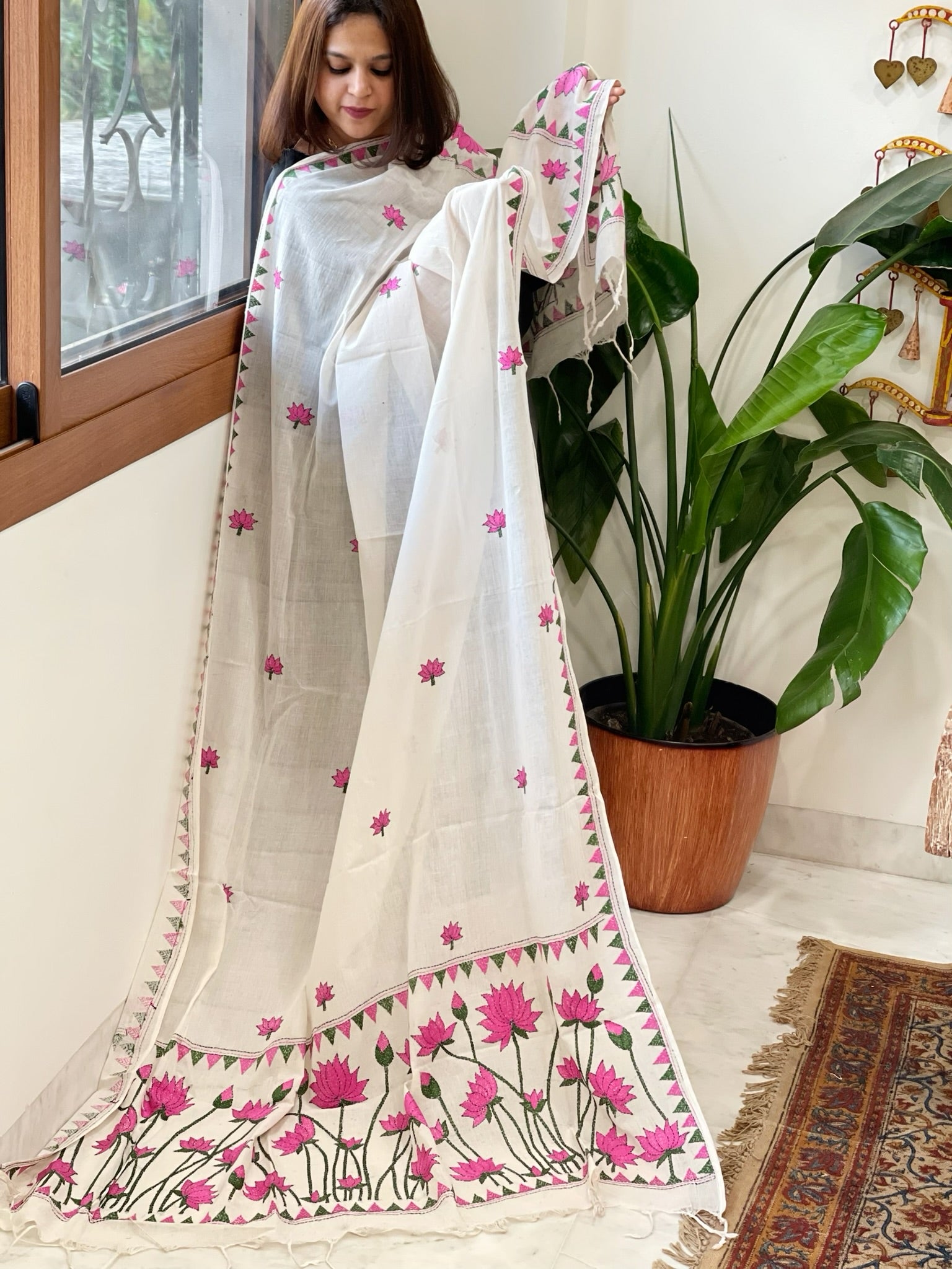 Off-White Handmade Kantha Dupatta in Pure Cotton