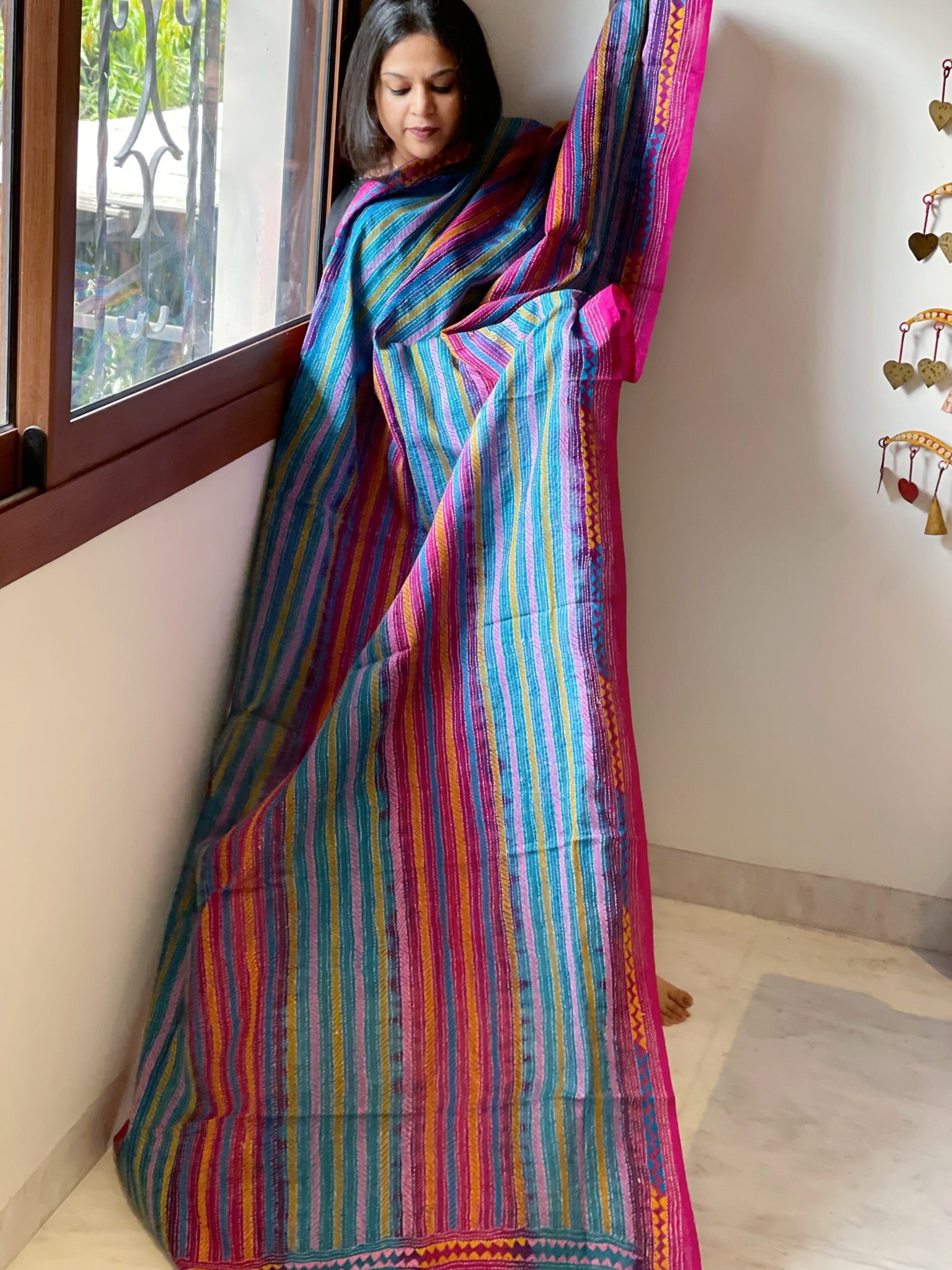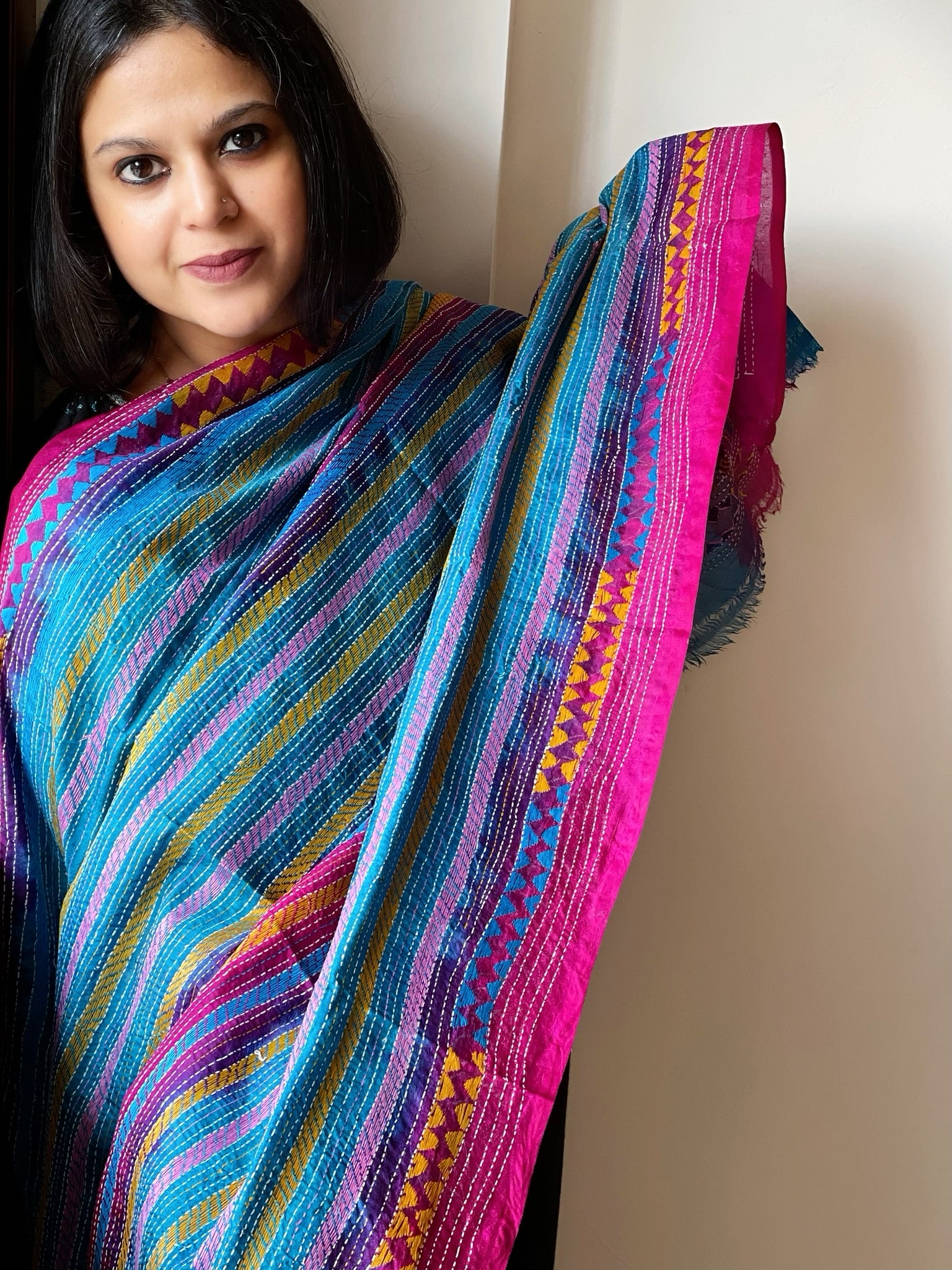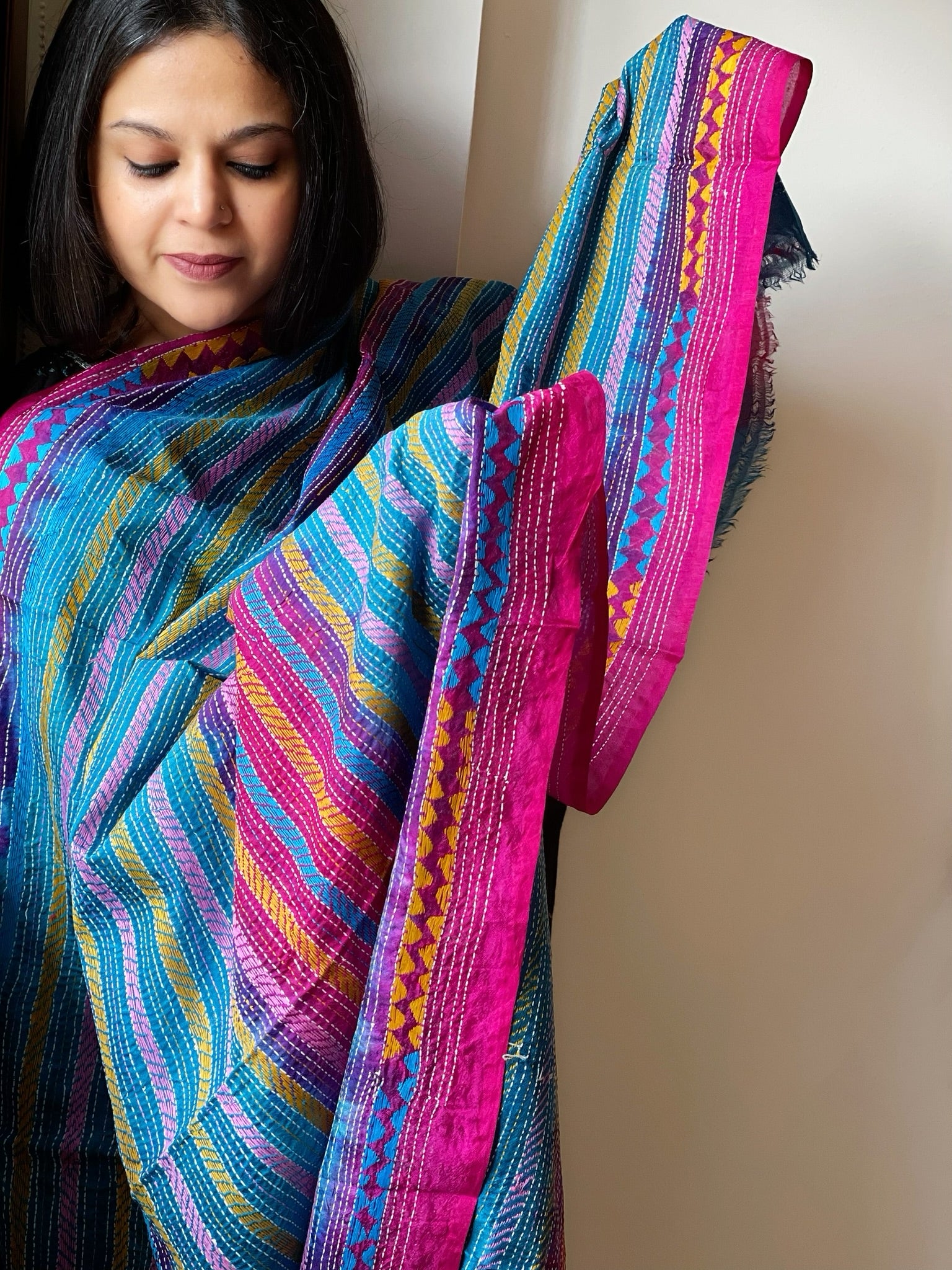 Expertly crafted and truly one-of-a-kind, our Handmade Kantha Dupatta in Silk is a masterpiece. Made from Bangalore silk and beautifully dyed and embroidered by Bengali artisans, each piece is a unique work of art. Elevate your wardrobe with this exquisite accessory.