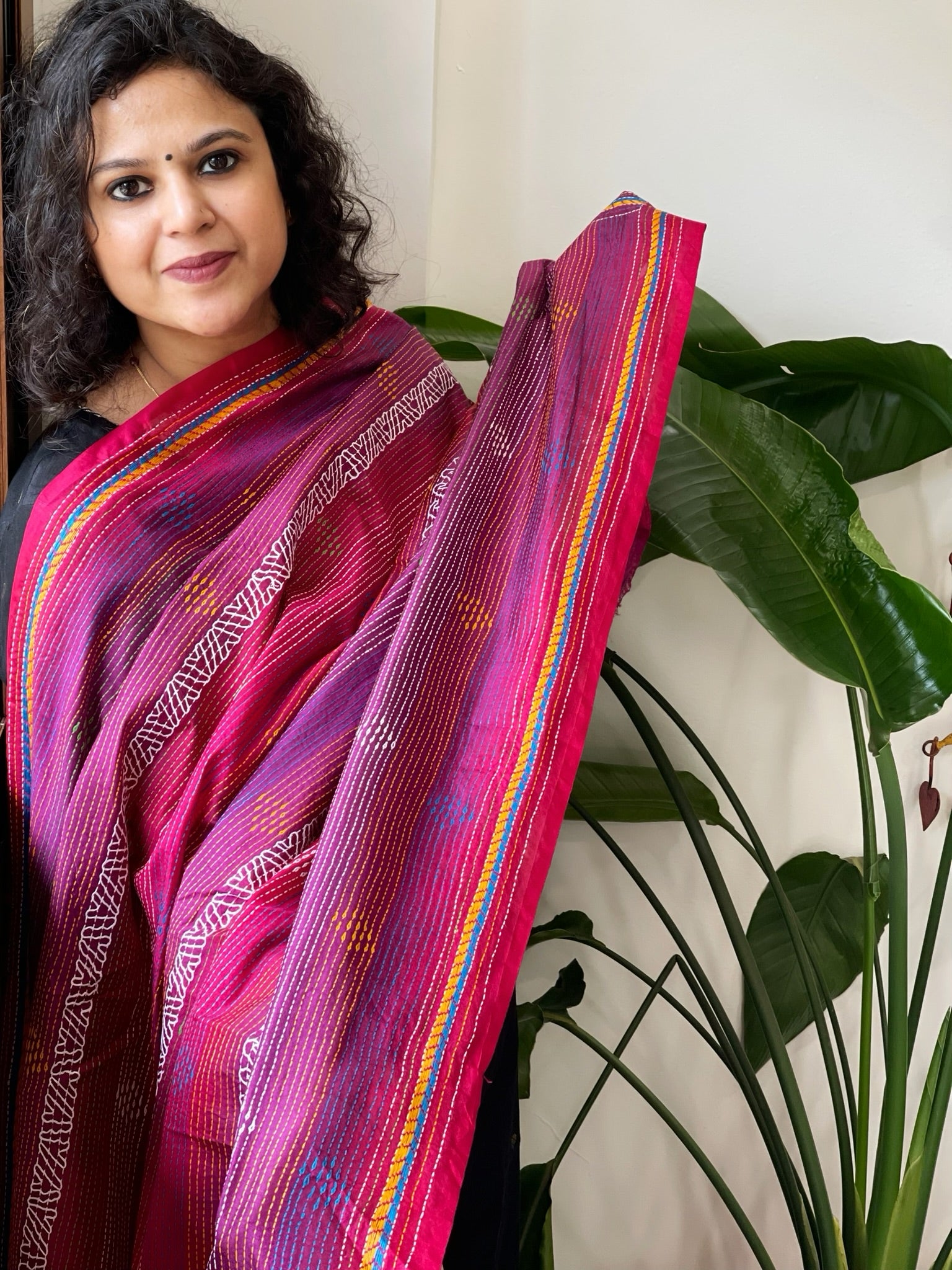 Purple, Pink Handmade Kantha Dupatta in Silk