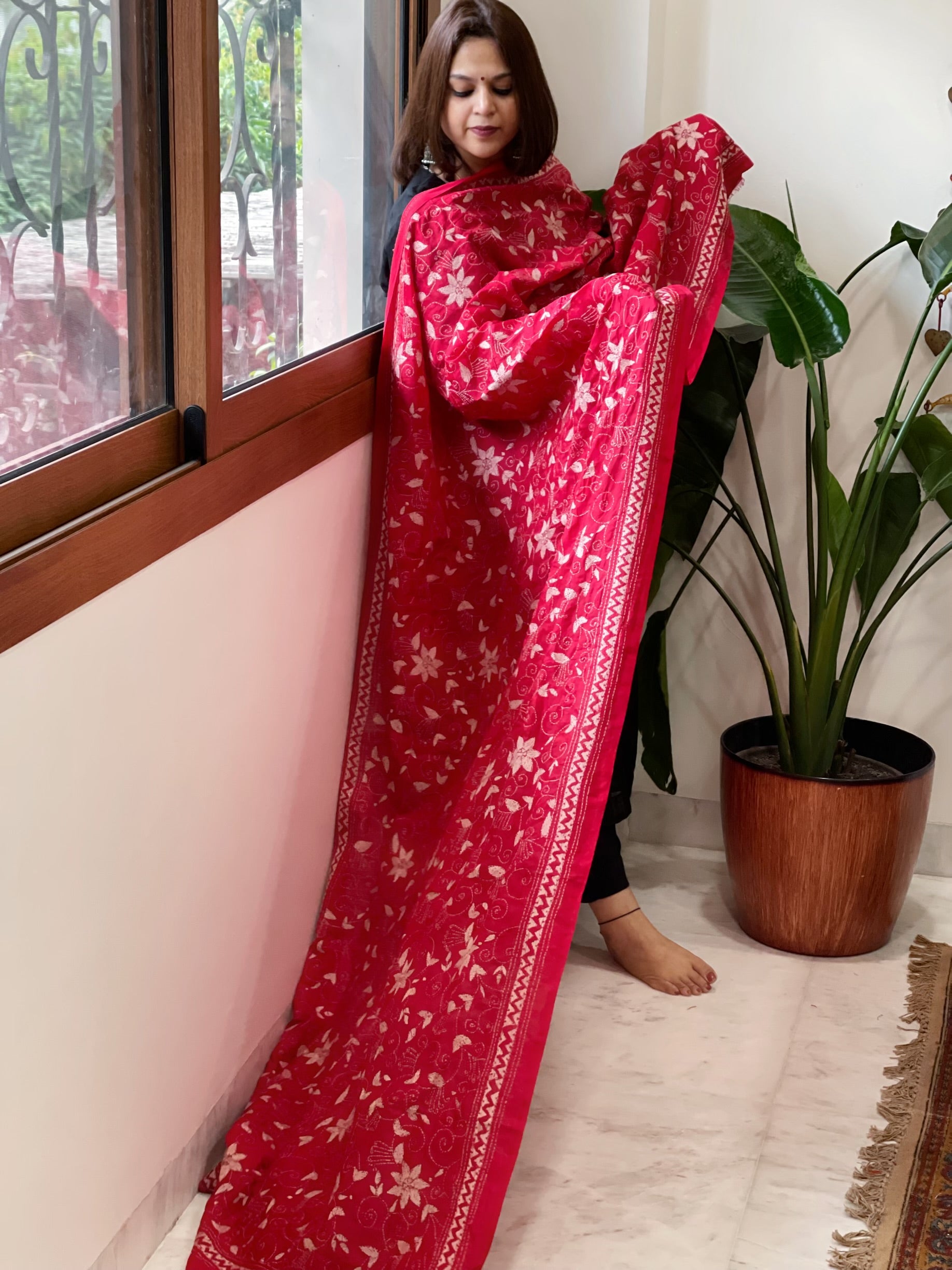 Expertly crafted and truly one-of-a-kind, our Handmade Kantha Dupatta in Silk is a masterpiece. Made from Bangalore silk and beautifully dyed and embroidered by Bengali artisans, each piece is a unique work of art. Elevate your wardrobe with this exquisite accessory.