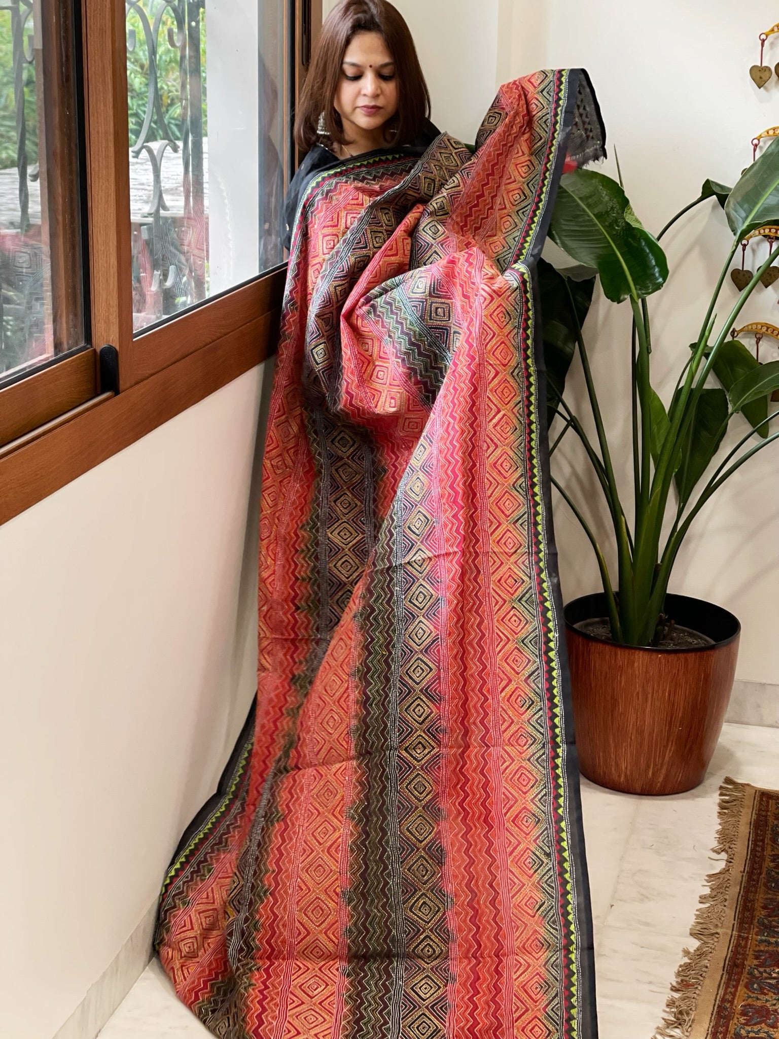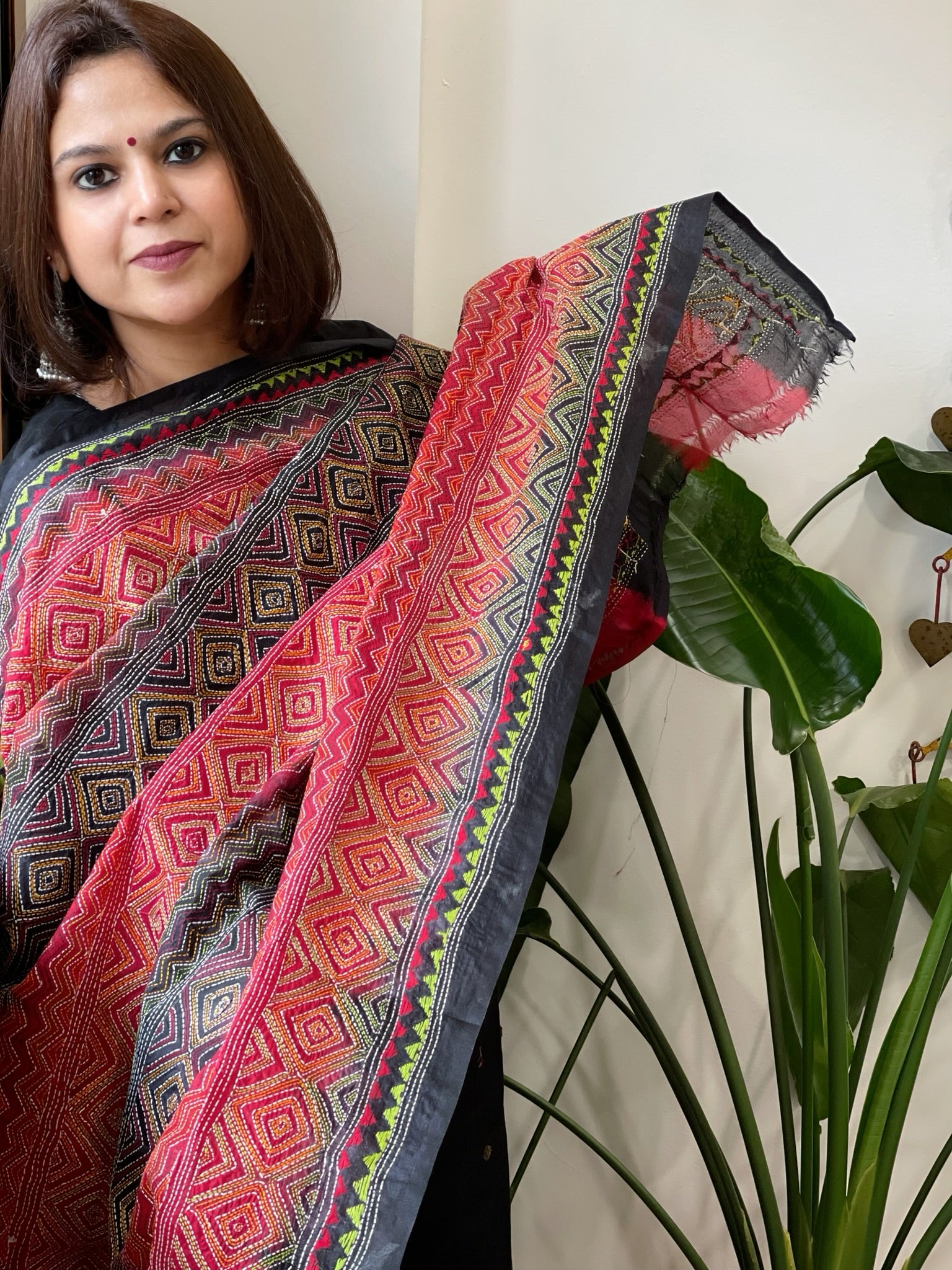 Expertly crafted and truly one-of-a-kind, our Handmade Kantha Dupatta in Silk is a masterpiece. Made from Bangalore silk and beautifully dyed and embroidered by Bengali artisans, each piece is a unique work of art. Elevate your wardrobe with this exquisite accessory.