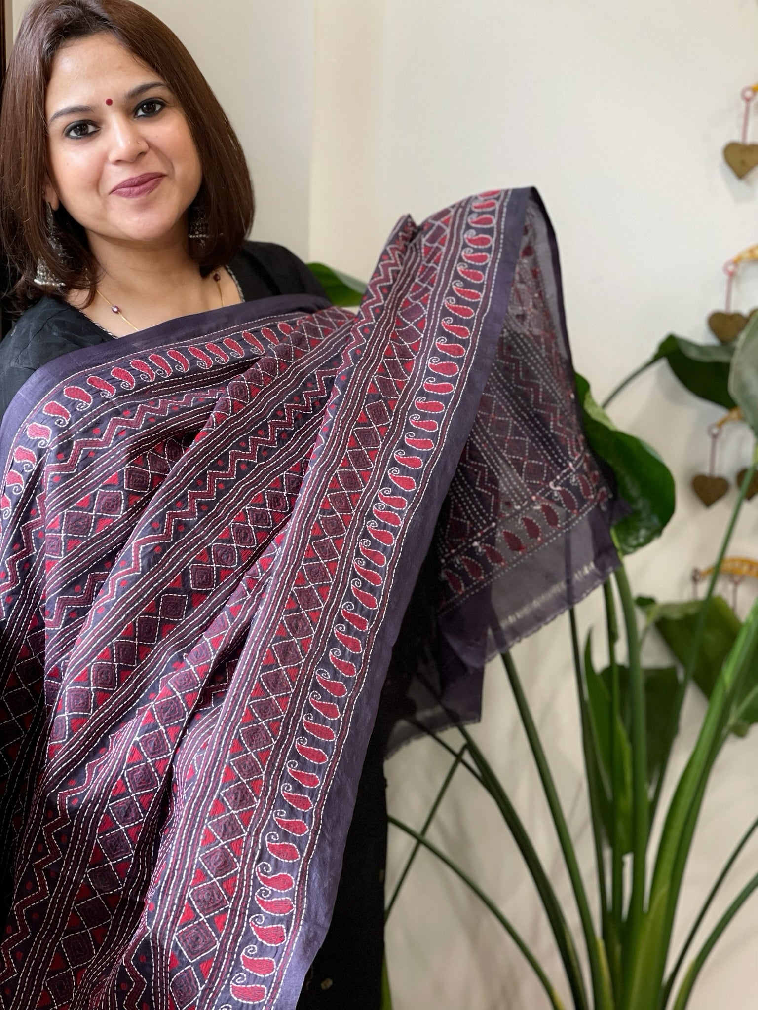 Expertly crafted and truly one-of-a-kind, our Handmade Kantha Dupatta in Silk is a masterpiece. Made from Bangalore silk and beautifully dyed and embroidered by Bengali artisans, each piece is a unique work of art. Elevate your wardrobe with this exquisite accessory.