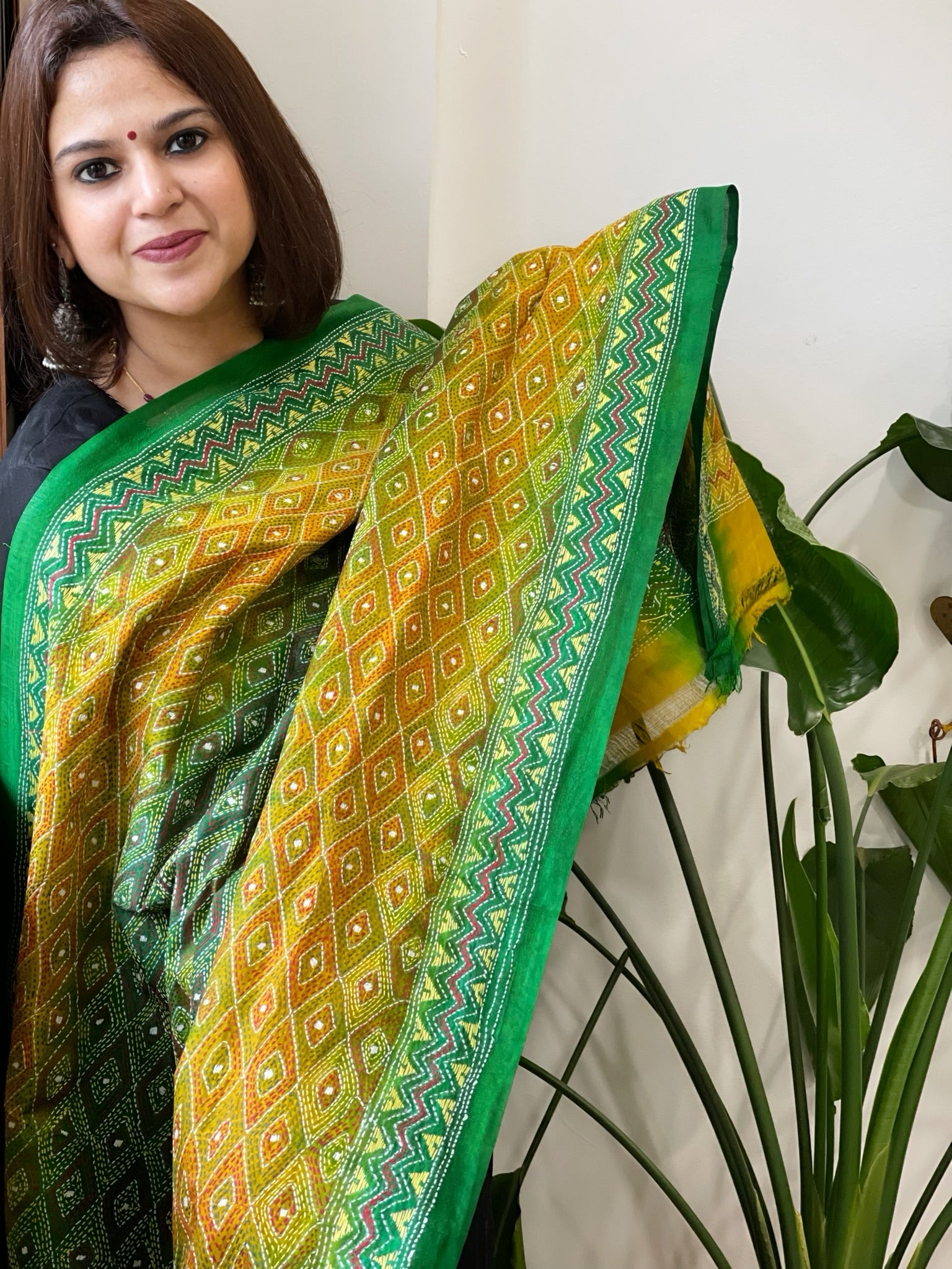 Yellow and Green Handmade Kantha Dupatta in Silk