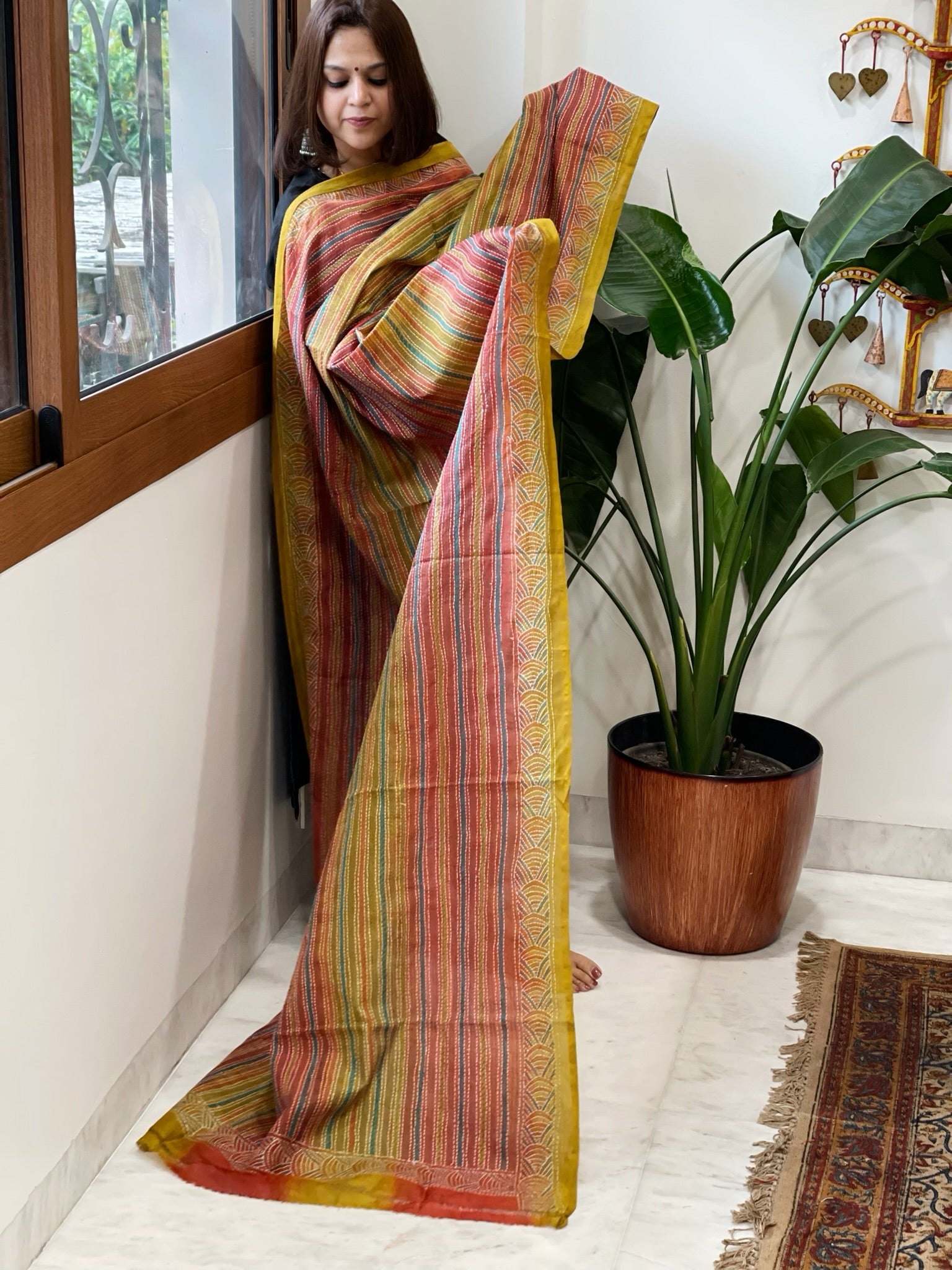 Rust and Greenish Yellow Handmade Kantha Dupatta in Silk