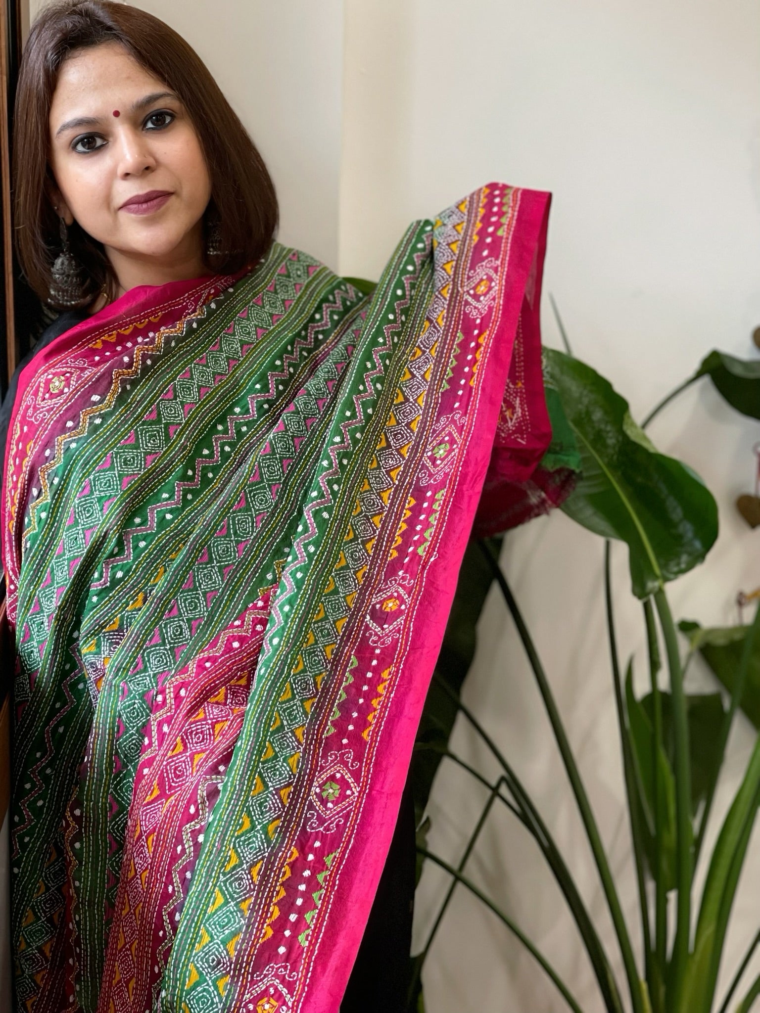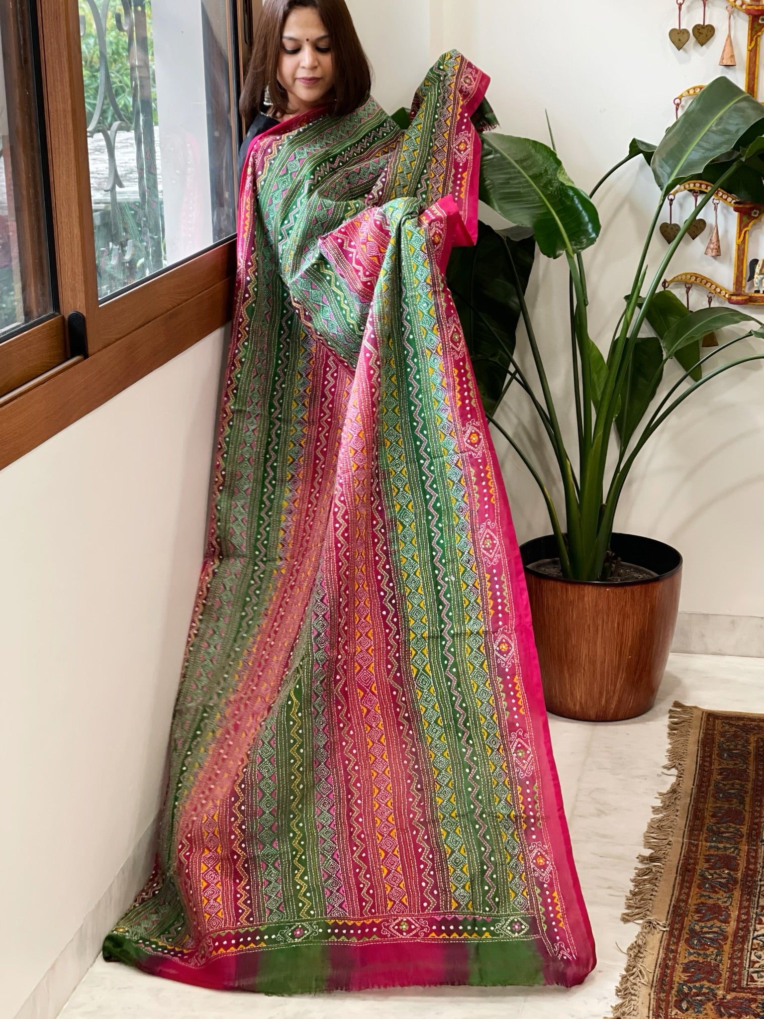 Expertly crafted and truly one-of-a-kind, our Handmade Kantha Dupatta in Silk is a masterpiece. Made from Bangalore silk and beautifully dyed and embroidered by Bengali artisans, each piece is a unique work of art. Elevate your wardrobe with this exquisite accessory.