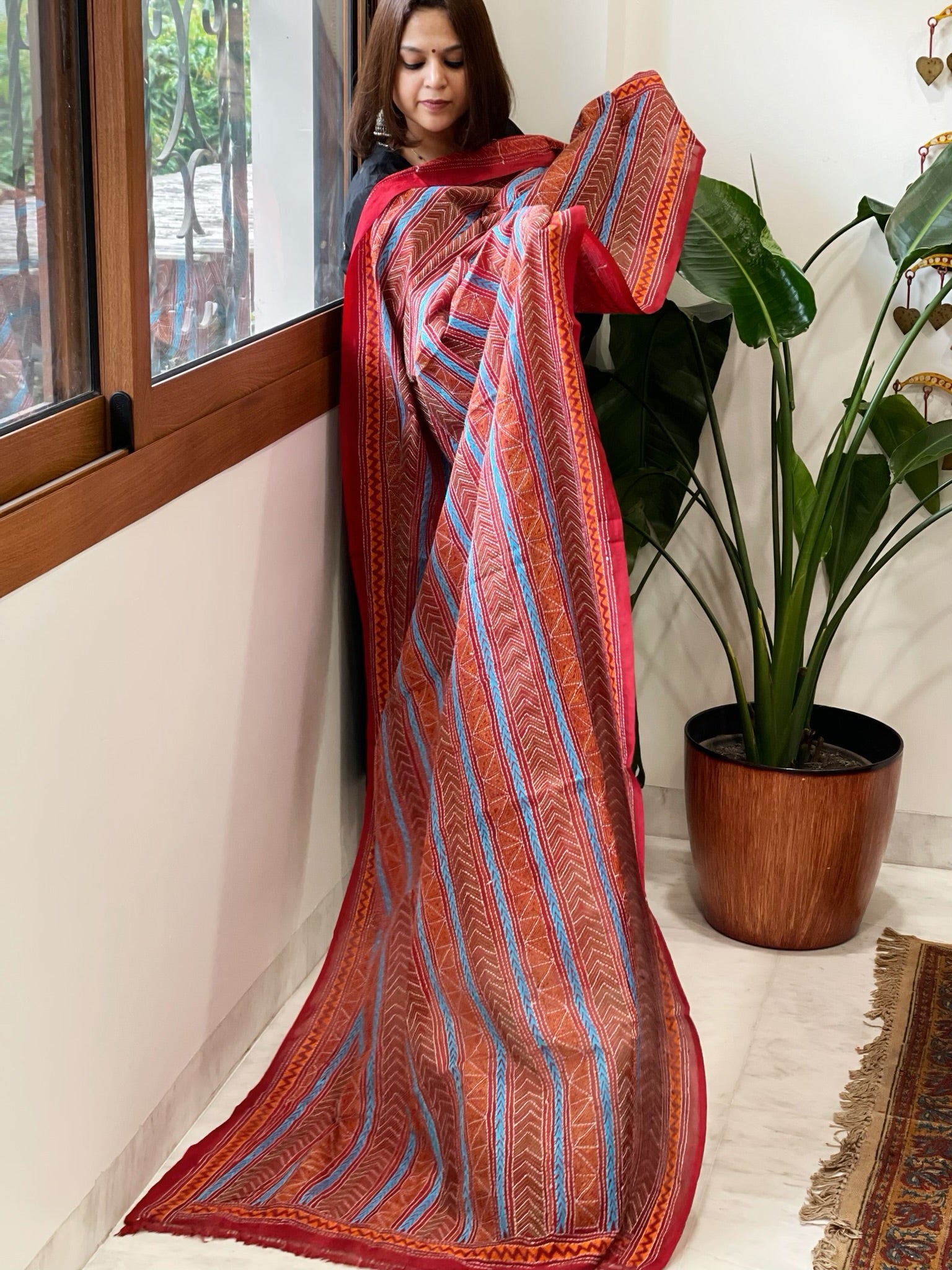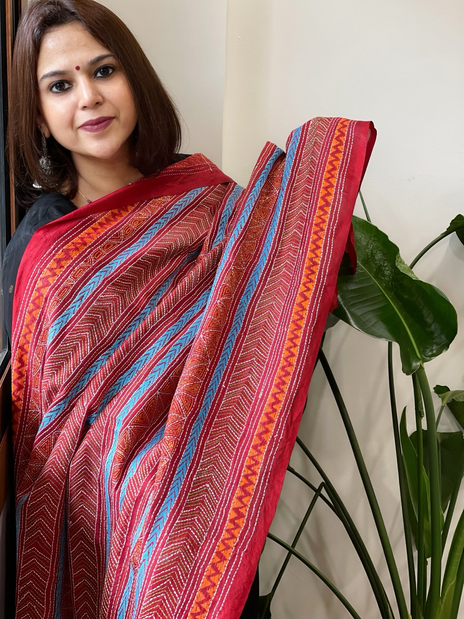 Expertly crafted and truly one-of-a-kind, our Handmade Kantha Dupatta in Silk is a masterpiece. Made from Bangalore silk and beautifully dyed and embroidered by Bengali artisans, each piece is a unique work of art. Elevate your wardrobe with this exquisite accessory.